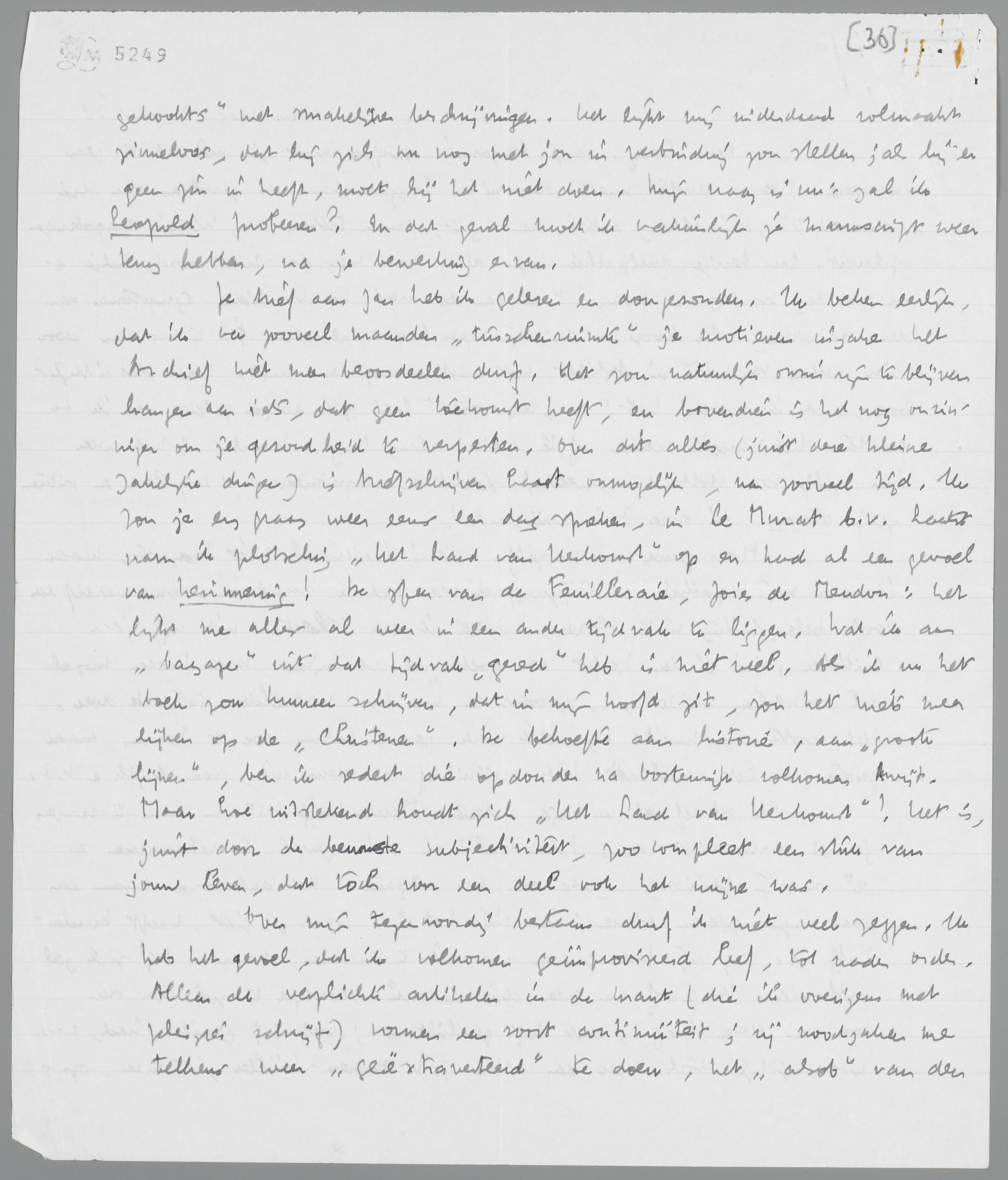 Je brief aan Jan heb ik gelezen en doorgezonden. Ik beken eerlijk, dat ik na zooveel maanden ‘tusschenruimte’ je motieven inzake het Archief niet meer beoordeelen durf. Het zou natuurlijk onzin zijn te blijven hangen aan iets, dat geen toekomst heeft, en bovendien is het nog onzinniger om je gezondheid te verpesten. Over dit alles (juist deze kleine zakelijke dingen) is briefschrijven haast onmogelijk, na zooveel tijd. Ik zou je erg graag weer eens een dag spreken, in Le Murat b.v. Laatst nam ik plotseling Het Land van Herkomst op en had al een gevoel van herinnering! De sfeer van de Feuilleraie, Joies de Meudon: het lijkt me alles al weer in een ander tijdvak te liggen. Wat ik aan ‘bagage’ uit dat tijdvak ‘gered’ heb is niet veel. Als ik nu het boek zou kunnen schrijven, dat in mijn hoofd zit, zou het niets meer lijken op de Christenen. De behoefte aan historie, aan ‘groote lijnen’, ben ik sedert die opdonder na Oostenrijk volkomen kwijt. Maar hoe uitstekend houdt zich Het Land van Herkomst! Het is, juist door de bewuste subjectiviteit, zoo compleet een stuk van jouw leven, dat toch voor een deel ook het mijne was.