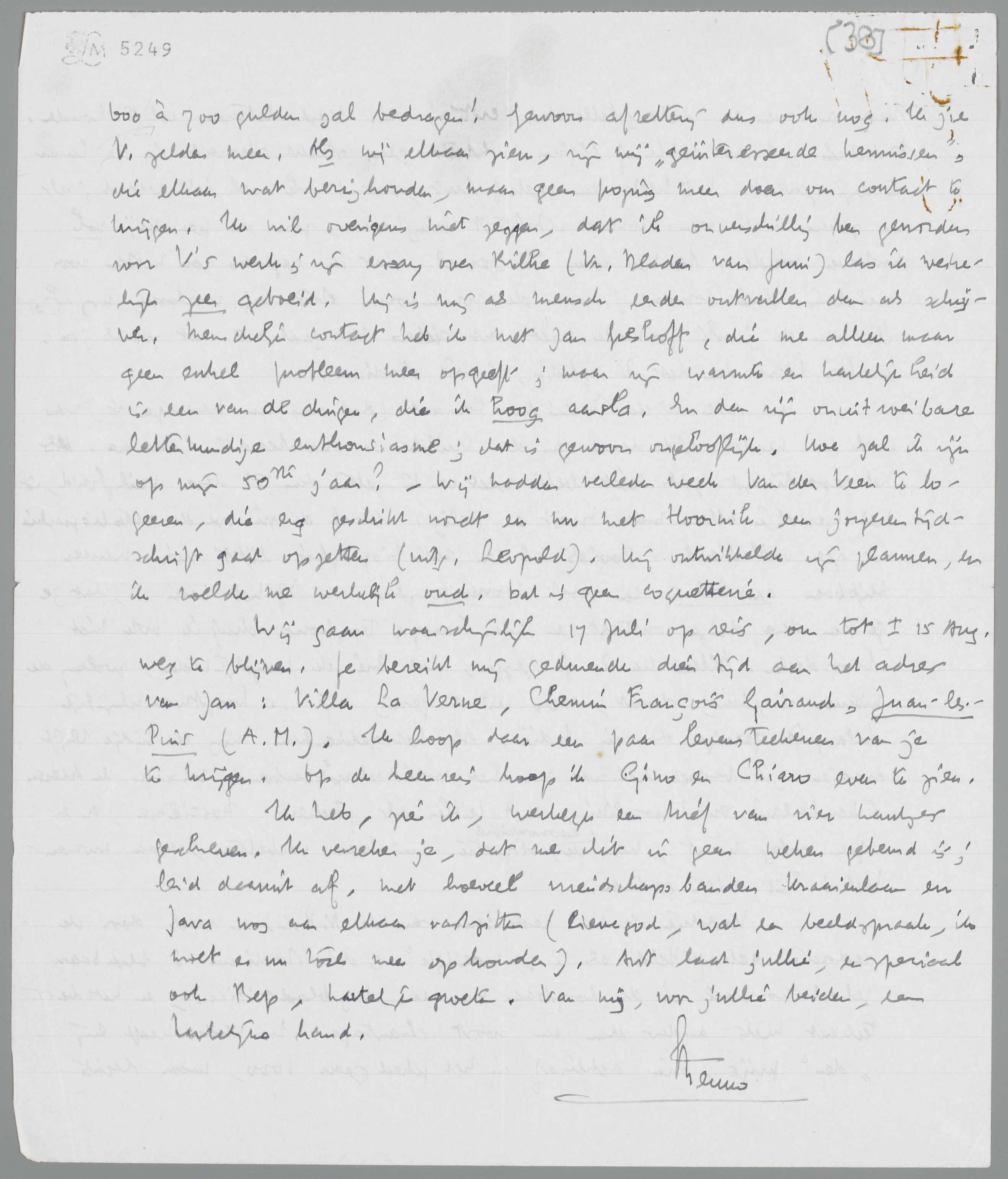 Wij gaan waarschijnlijk 17 Juli op reis, om tot ± 15 Aug. weg te blijven. Je bereikt mij gedurende dien tijd aan het adres van Jan: Villa La Verne, Chemin François Gairaud, Juan-les-Pins (A.M.). Ik hoop daar een paar levensteekenen van je te krijgen. Op de heenreis hoop ik Gino en Chiaro even te zien.