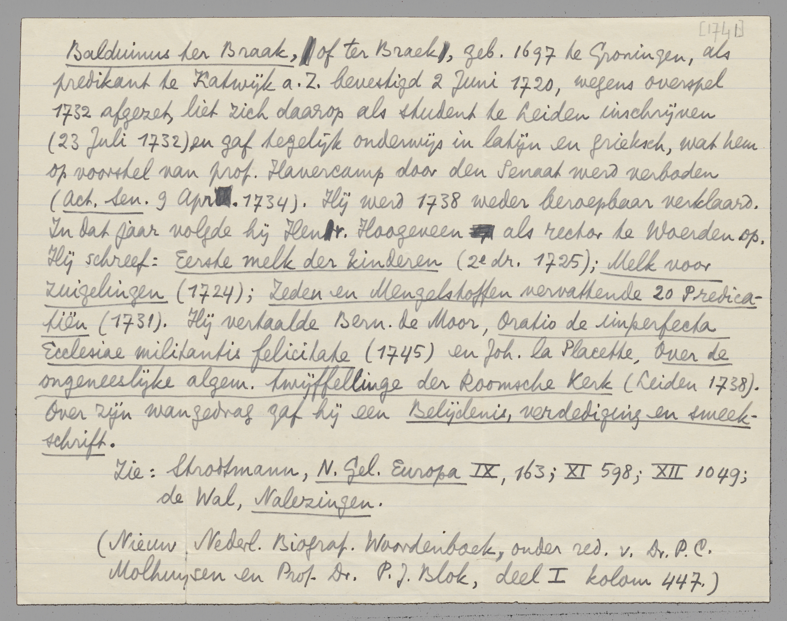 Balduinus ter Braak, of ter Braek, geb. 1697 te Groningen, als predikant te Katwijk a.Z. bevestigd 2 Juni 1720, wegens overspel 1732 afgezet, liet zich daarop als student te Leiden inschrijven (23 Juli 1732) en gaf tegelijk onderwijs in latijn en grieksch, wat hem op voorstel van prof. Havercamp door den Senaat werd verboden (Act. Sen. 9 April 1734). Hij werd 1738 weder beroepbaar verklaard. In dat jaar volgde hij Henr. Hoogeveen als rector te Woerden op.