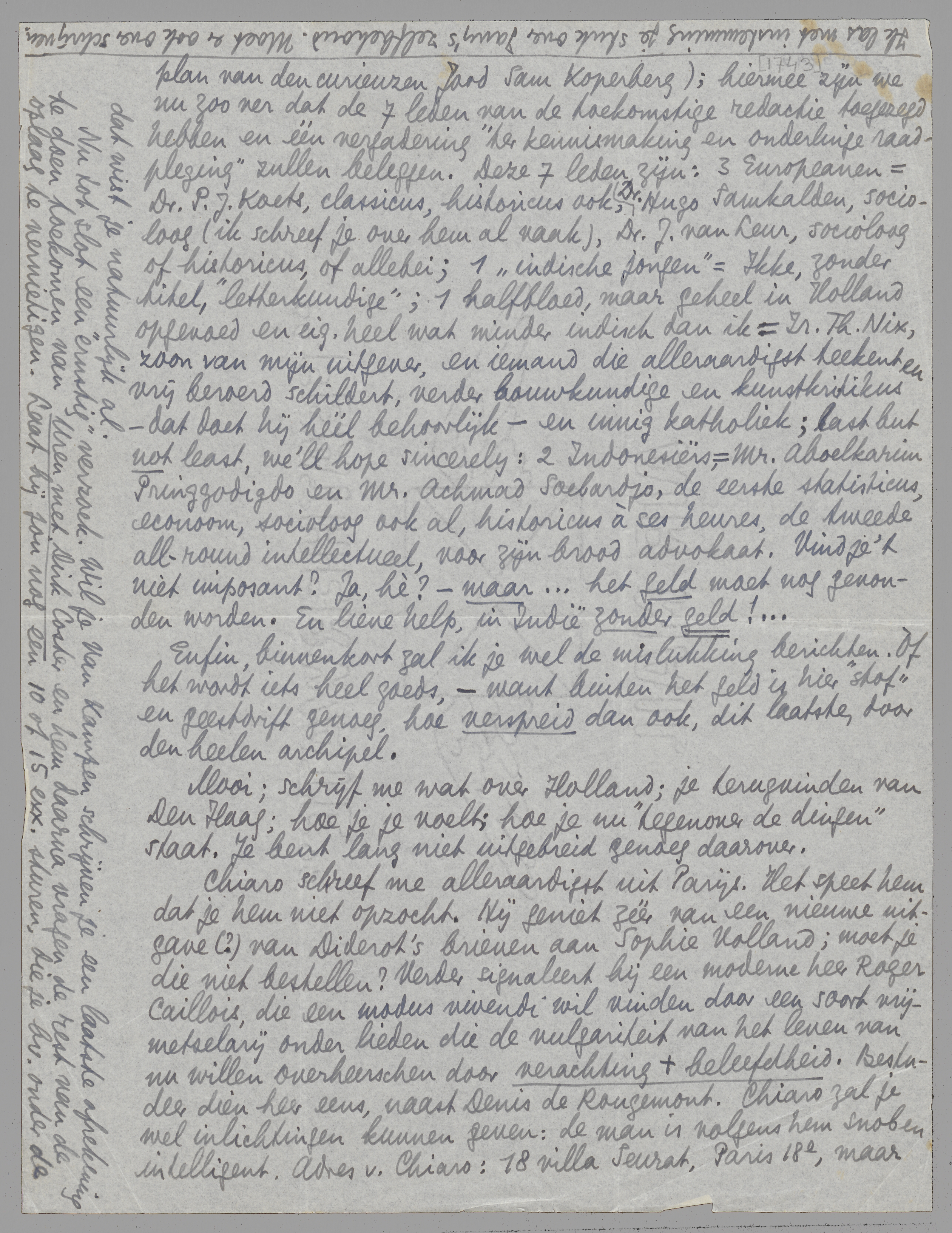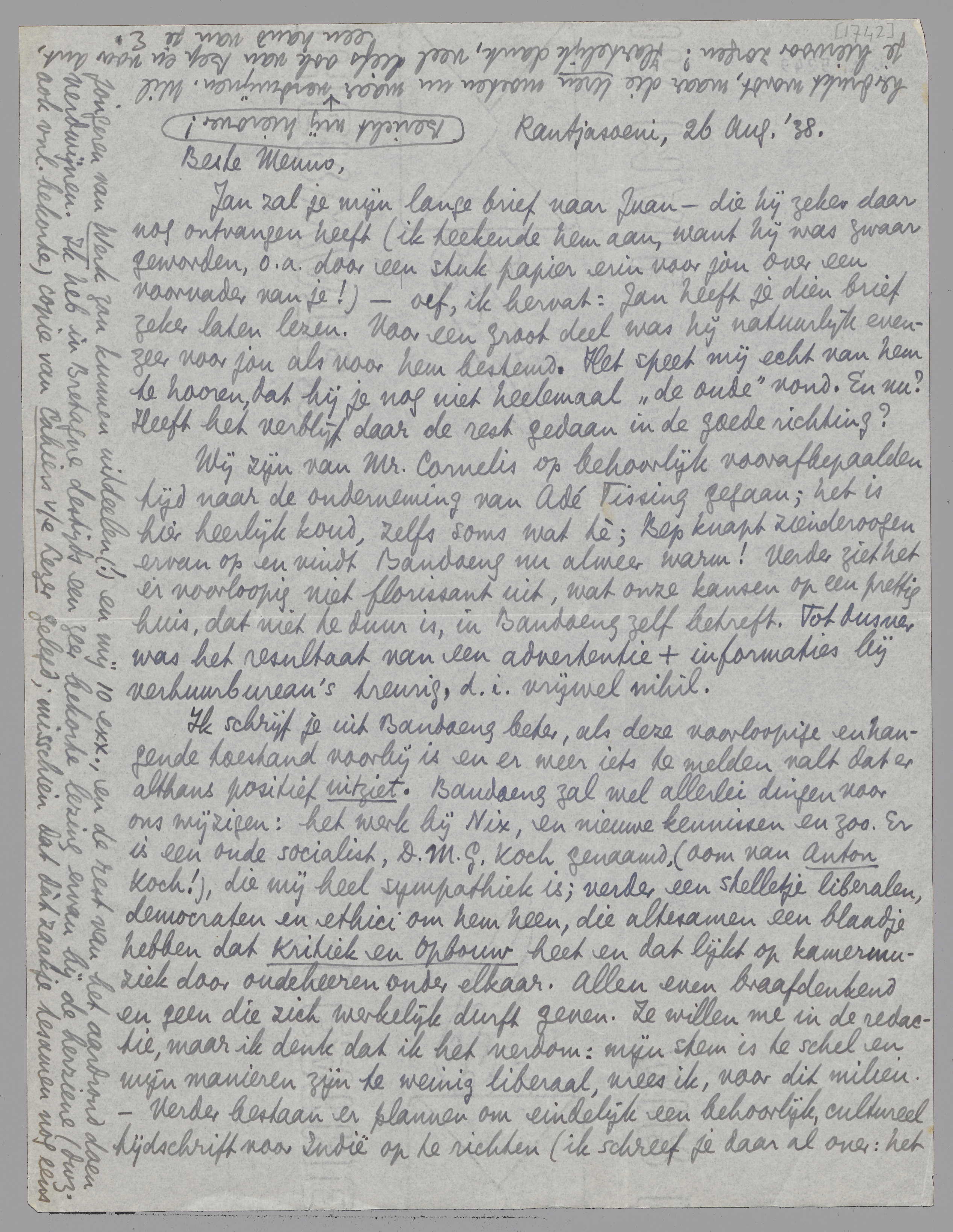 Ik schrijf je uit Bandoeng beter, als deze voorloopige en hangende toestand voorbij is en er weer iets te melden valt dat er althans positief uitziet. Bandoeng zal wel allerlei dingen voor ons wijzigen: het werk bij Nix, en nieuwe kennissen en zoo. Er is een oude socialist, D.M.G. Koch genaamd, (oom van Anton Koch!), die mij heel sympathiek is; verder een stelletje liberalen, democraten en ethici om hem heen, die altesamen een blaadje hebben dat Kritiek en Opbouw heet en dat lijkt op kamermuziek door oudeheeren onder elkaar. Allen even braaf denkend en geen die zich werkelijk durft geven. Ze willen me in de redactie, maar ik denk dat ik het verdom: mijn stem is te schel en mijn manieren zijn te weinig liberaal, vrees ik, voor dit milieu. - Verder bestaan er plannen om eindelijk een behoorlijk, cultureel tijdschrift voor Indië op te richten (ik schreef je daar al over: het plan van den curieuzen Jood Sam Koperberg); hiermee zijn we nu zoo ver dat de 7 leden van de toekomstige redactie toegezegd hebben en één vergadering ‘ter kennismaking en onderlinge raadpleging’ zullen beleggen. Deze 7 leden zijn: 3 Europeanen = Dr. P.J. Koets, classicus, historicus ook, Dr. Hugo Samkalden, socioloog (ik schreef je over hem al vaak), Dr. J. van Leur, socioloog of historicus, of allebei; 1 ‘indische jongen’ = Ikke, zonder titel, ‘letterkundige’; 1 halfbloed, maar geheel in Holland opgevoed en eig. heel wat minder indisch dan ik = Ir. Th. Nix, zoon van mijn uitgever, en iemand die alleraardigst teekent en vrij beroerd schildert, verder bouwkundige en kunstkritikus - dat doet hij héél behoorlijk - en innig katholiek; last but not least, we'll hope sincerely: 2 Indonesiërs, = Mr. Aboelkarim Pringgodigdo en Mr. Achmad Soebardjo, de eerste statisticus, econoom, socioloog ook al, historicus à ses heures, de tweede all-round intellectueel, voor zijn brood advokaat. Vind je 't niet imposant? Ja, hè? - maar... het geld moet nog gevonden worden. En lieve help, in Indië zonder geld!...