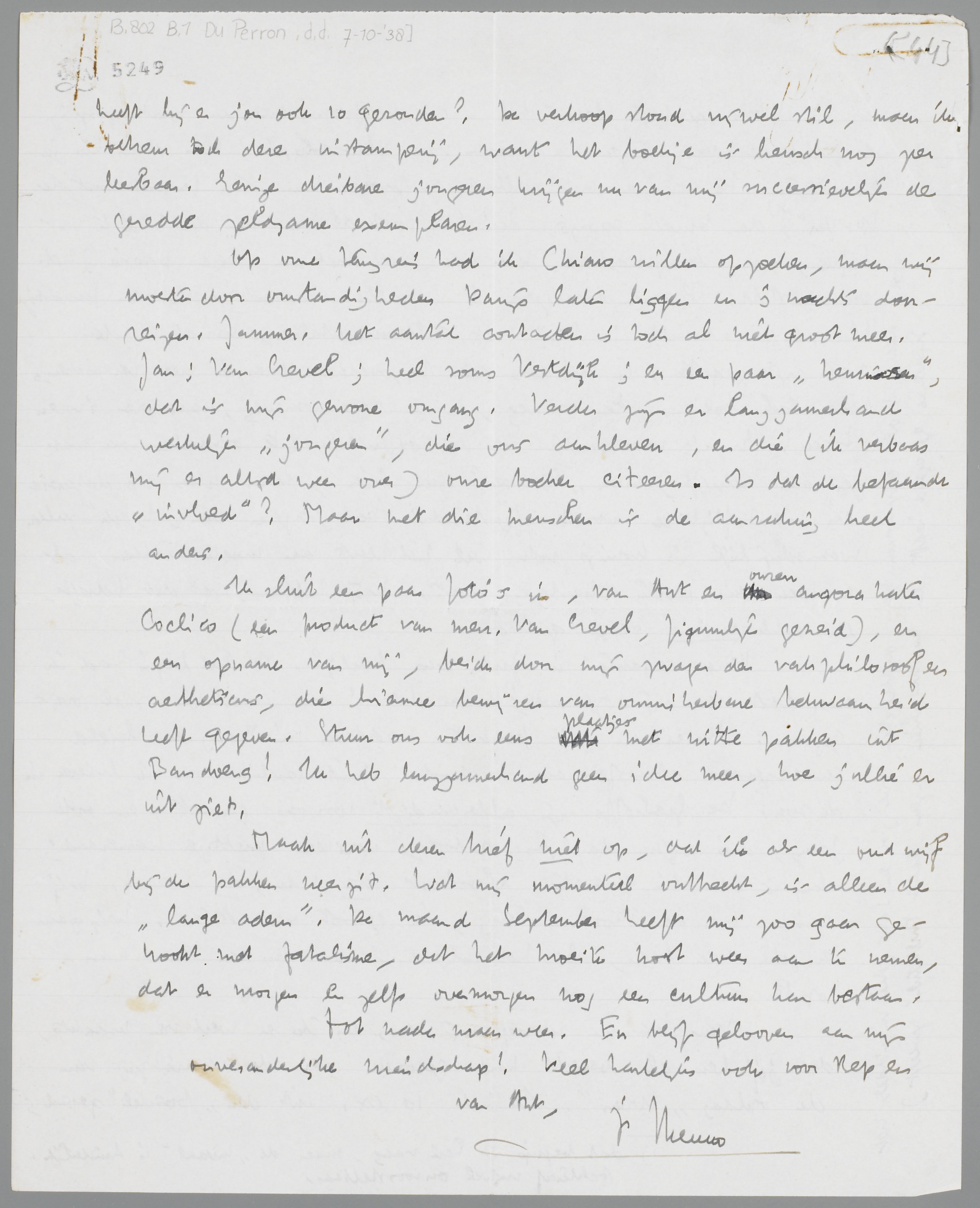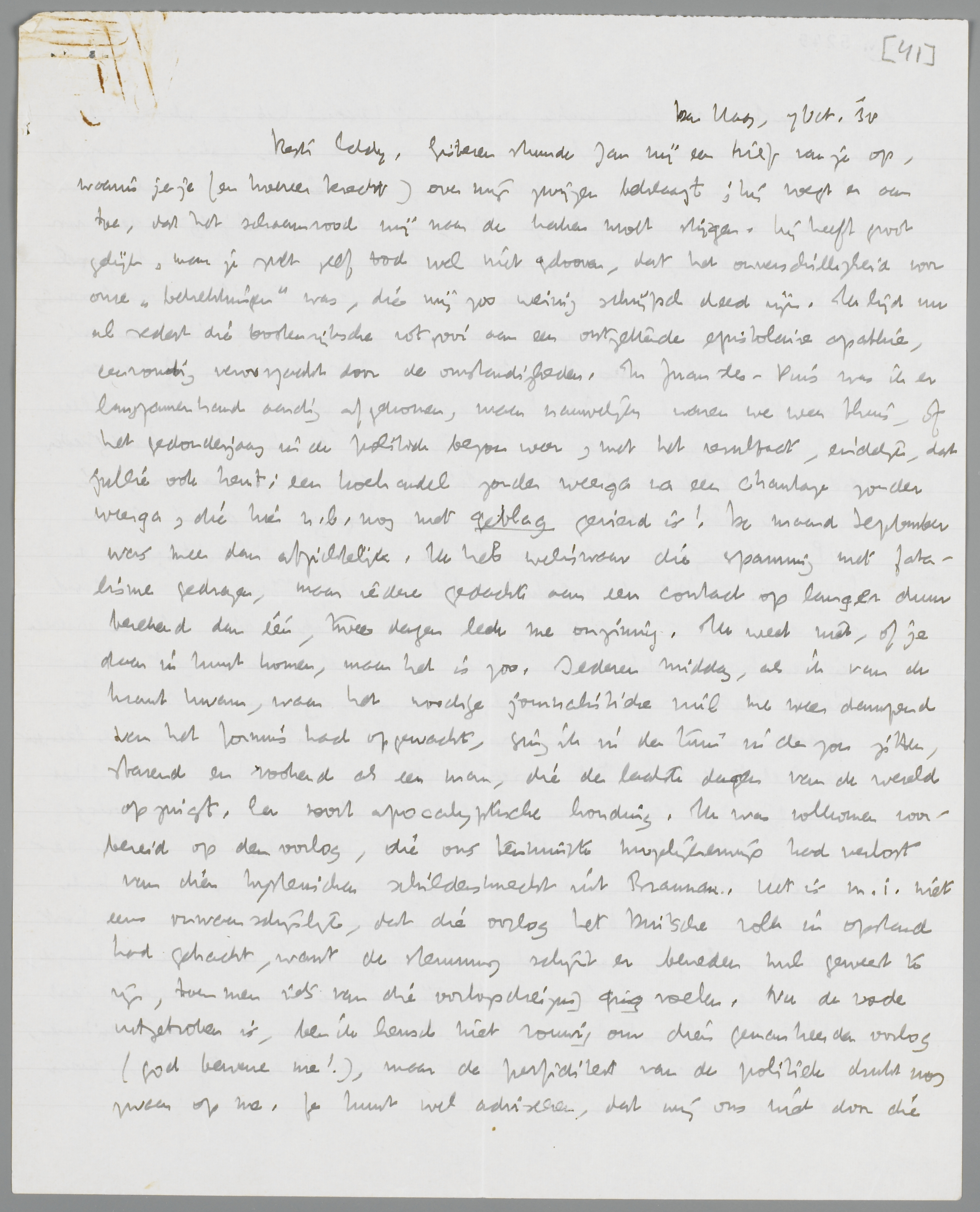 Maak uit dezen brief niet op, dat ik als een oud wijf bij de pakken neerzit. Wat mij momenteel ontbreekt, is alleen de ‘lange adem’. De maand September heeft mij zoo gaar gekookt met fatalisme, dat het moeite kost weer aan te nemen, dat er morgen en zelfs overmorgen nog een cultuur kan bestaan.