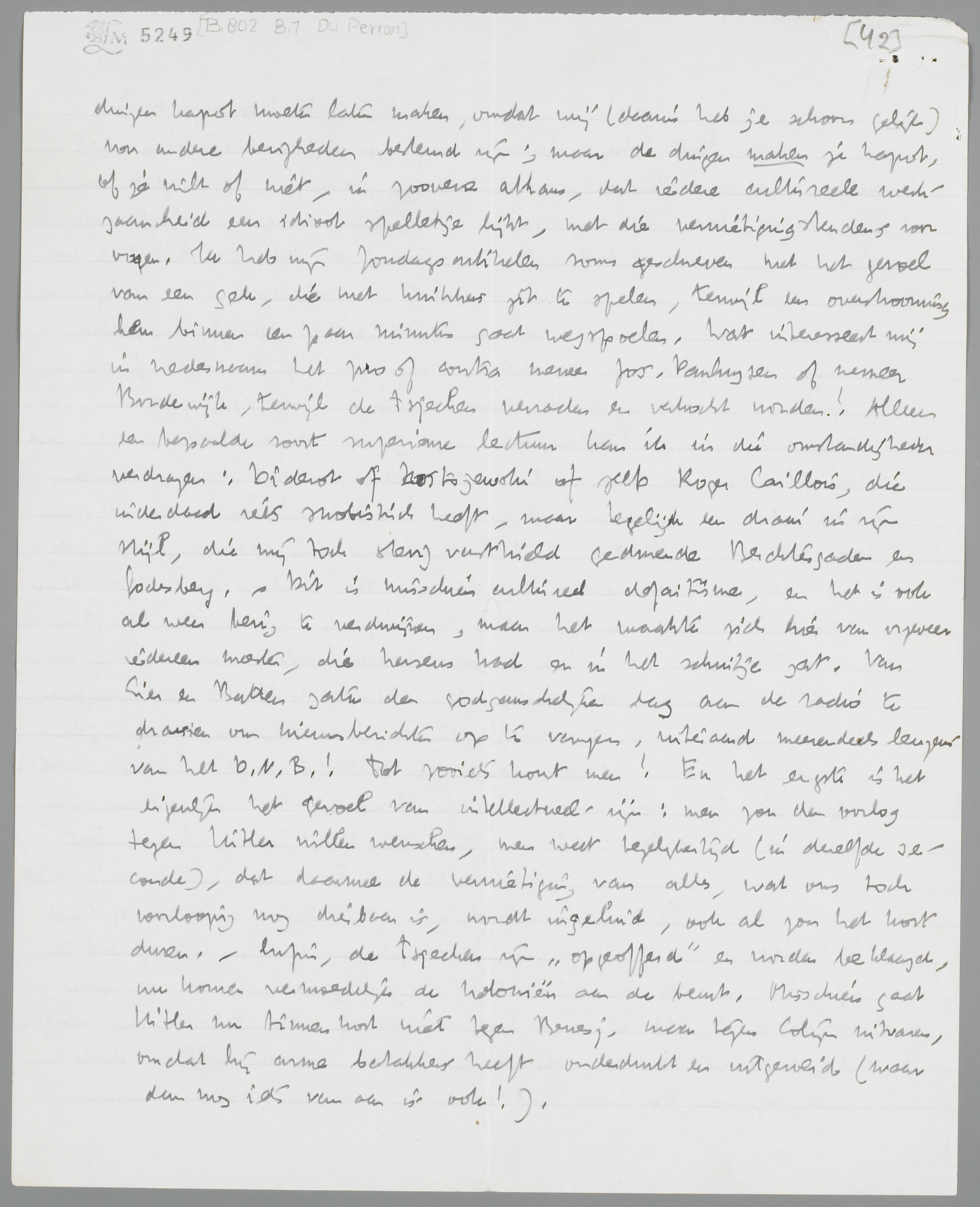 Gisteren stuurde Jan mij een brief van je op, waarin je je (en hoezeer terecht) over mijn zwijgen beklaagt; hij voegt er aan toe, dat het schaamrood mij naar de kaken moet stijgen. Hij heeft groot gelijk, maar je zult zelf ook wel niet gelooven, dat het onverschilligheid voor onze ‘betrekkingen’ was, die mij zoo weinig schrijfsch deed zijn. Ik lijd nu al sedert die Oostenrijksche rotzooi aan een ontzettende epistolaire apathie, eenvoudig veroorzaakt door de omstandigheden. In Juan-les-Pins was ik er langzamerhand aardig afgekomen, maar nauwelijks waren we weer thuis, of het gedonderjaag in de politiek begon weer, met het resultaat, eindelijk, dat jullie ook kent: een koehandel zonder weerga na een chantage zonder weerga, die hier n.b. nog met gevlag gevierd is! De maand September was meer dan afzichtelijk. Ik heb weliswaar die spanning met fatalisme gedragen, maar iedere gedachte aan een contact op langer duur berekend dan één, twee dagen leek me onzinnig. Ik weet niet, of je daar in kunt komen, maar het is zoo. Iederen middag, als ik van de krant kwam, waar het noodige journalistieke vuil me weer dampend van het fornuis had opgewacht, ging ik in den tuin in de zon zitten, starend en rookend als een man, die de laatste dagen van de wereld opzuigt. Een soort apocalyptische houding. Ik was volkomen voorbereid op den oorlog, die ons tenminste mogelijkerwijs had verlost van dien hysterischen schildersknecht uit Braunau. Het is m.i. niet eens onwaarschijnlijk, dat die oorlog het Duitsche volk in opstand had gebracht, want de stemming schijnt er beneden nul geweest te zijn, toen men iets van die oorlogsdreiging ging voelen. Nu de vrede uitgebroken is, ben ik heusch niet rouwig om dien gemankeerden oorlog (god beware me!), maar de perfiditeit van de politiek drukt nog zwaar op me. Je kunt wel adviseeren, dat wij ons niet door die dingen kapot moeten laten maken, omdat wij (daarin heb je schoon gelijk) voor andere bezigheden bestemd zijn; maar de dingen maken je kapot, of je wilt of niet, in zooverre althans, dat iedere cultureele werkzaamheid een idioot spelletje lijkt, met die vernietigingstendens voor oogen. Ik heb mijn Zondagsartikelen soms geschreven met het gevoel van een gek, die met knikkers zit te spelen, terwijl een overstrooming hem binnen een paar minuten gaat wegspoelen. Wat interesseert mij in vredesnaam het pro of contra meneer Jos Panhuysen of meneer Bordewijk, terwijl de Tsjechen verraden en verkocht worden! Alleen een bepaalde soort superieure lectuur kan ik in die omstandigheden verdragen: Diderot of Dostojewski of zelfs Roger Caillois, die inderdaad iets snobistisch heeft, maar tegelijk een draai in zijn stijl, die mij toch stevig vasthield gedurende Berchtesgaden en Godesberg. - Dit is misschien cultureel defaitisme, en het is ook al weer bezig te verdwijnen, maar het maakte zich hier van ongeveer iedereen meester, die hersens had en in het schuitje zat. Van Lier en Batten zaten den godganschelijken dag aan de radio te draaien om nieuwsberichten op te vangen, uiteraard meerendeels leugens van het D.N.B.! Tot zooiets komt men! En het ergste is eigenlijk het gevoel van intellectueel-zijn: men zou den oorlog tegen Hitler willen wenschen, men weet tegelijkertijd (in dezelfde seconde), dat daarmee de vernietiging van alles, wat ons toch voorloopig nog dierbaar is, wordt ingeluid, ook al zou het kort duren. - Enfin, de Tsjechen zijn ‘opgeofferd’ en worden beklaagd, nu komen vermoedelijk de koloniën aan de beurt. Misschien gaat Hitler nu binnenkort niet tegen Benesj, maar tegen Colijn uitvaren, omdat hij arme batakkers heeft onderdrukt en uitgeroeid (waar dan nog iets van aan is ook!).