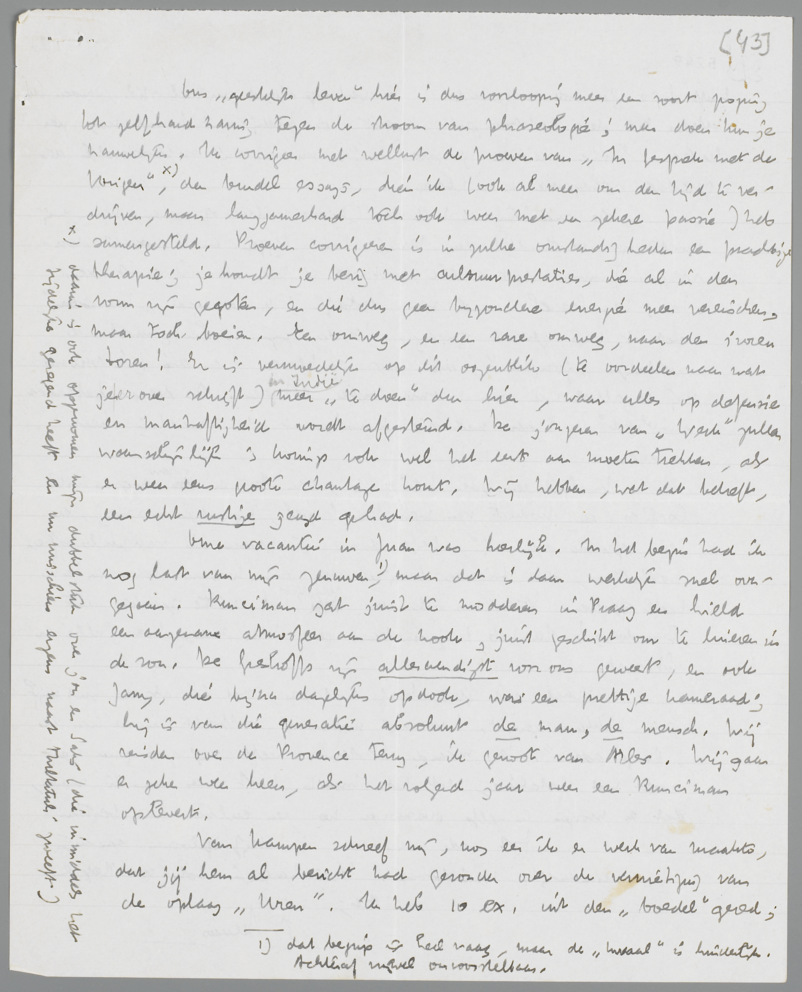 Onze vacantie in Juan was heerlijk. In het begin had ik nog last van mijn zenuwen [dat begrip is heel vaag, maar de ‘kwaal’ is hinderlijk. Achteraf vrijwel onvoorstelbaar.], maar dat is daar werkelijk snel overgegaan. Runciman zat juist te modderen in Praag en hield een aangename atmosfeer aan de kook, juist geschikt om te luieren in de zon. De Greshoffs zijn alleraardigst voor ons geweest, en ook Jany, die bijna dagelijks opdook, was een prettige kameraad; hij is van die generatie absoluut de man, de mensch. Wij reisden over de Provence terug, ik genoot van Arles. Wij gaan er zeker weer heen, als het volgend jaar weer een Runciman oplevert.