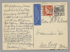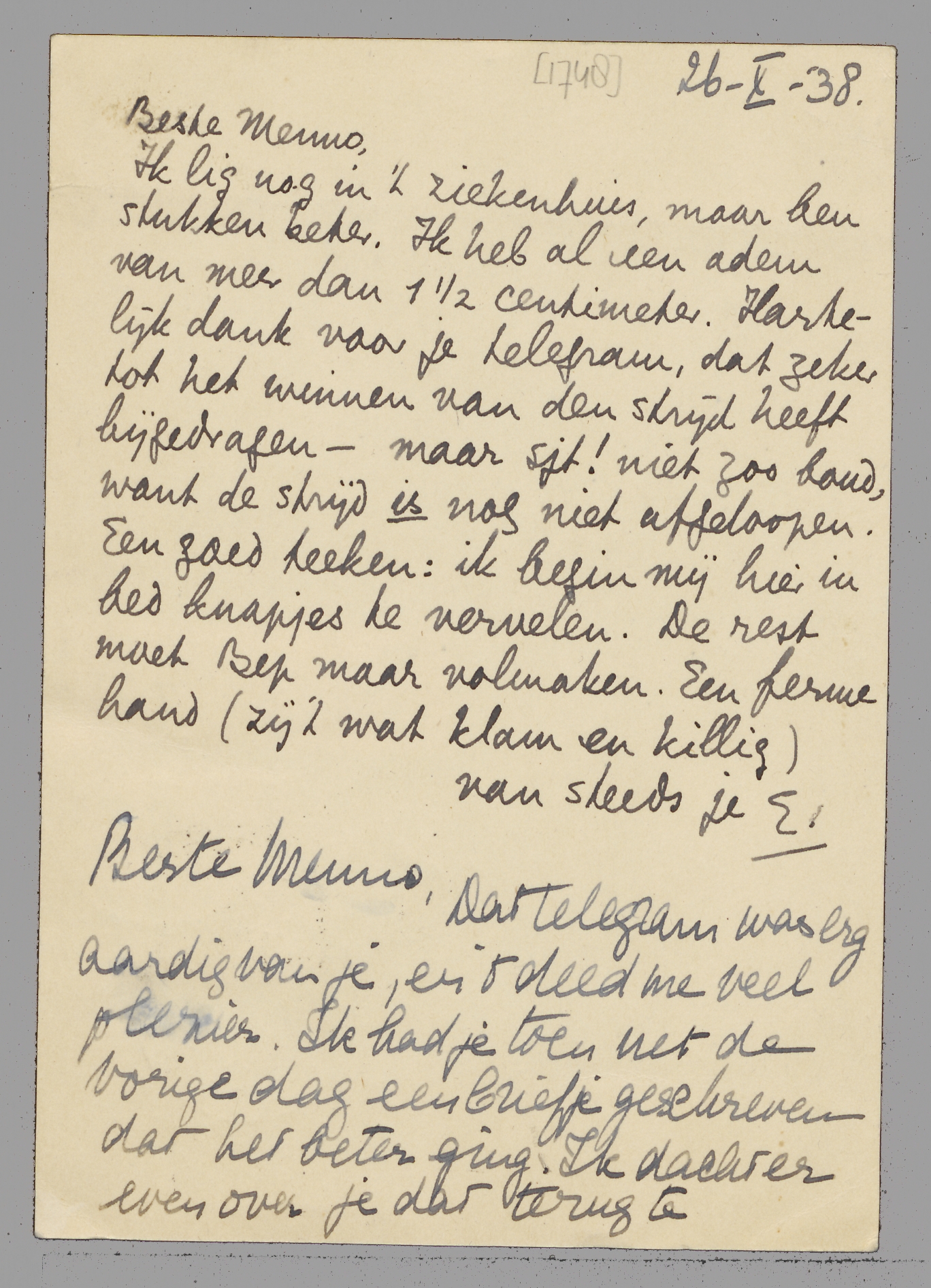 Ik lig nog in 't ziekenhuis, maar ben stukken beter. Ik heb al een adem van meer dan 1 ½ centimeter. Hartelijk dank voor je telegram, dat zeker tot het winnen van den strijd heeft bijgedragen - maar sjt! niet zoo boud, want de strijd is nog niet afgeloopen. Een goed teeken: ik begin mij hier in bed knapjes te vervelen. De rest moet Bep maar volmaken. Een ferme hand (zij 't wat klam en killig)