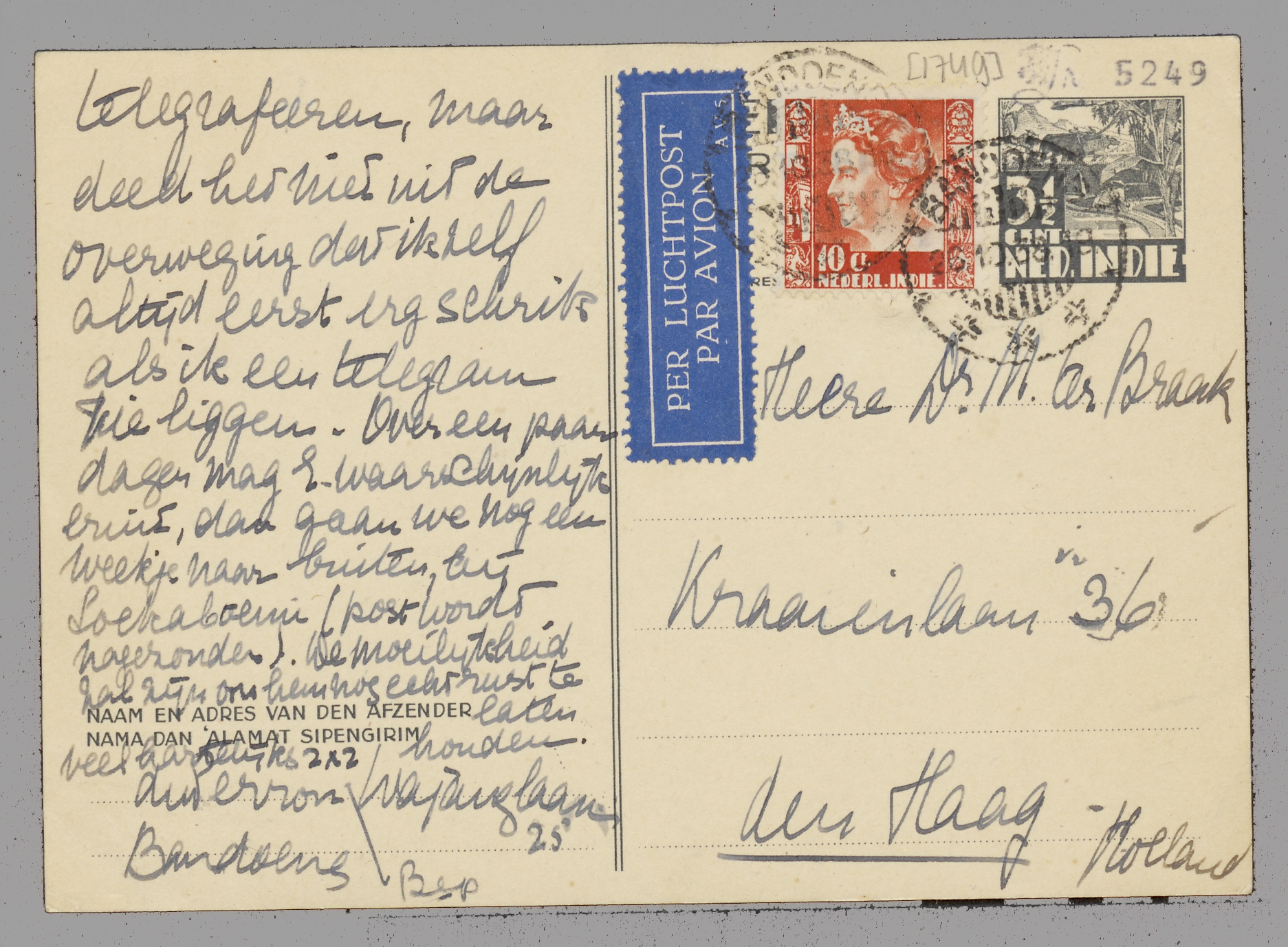 Dat telegram was erg aardig van je, en 't deed me veel plezier. Ik had je toen net de vorige dag een briefje geschreven dat het beter ging. Ik dacht er even over je dat terug te telegrafeeren, maar deed het niet uit de overweging dat ik zelf altijd eerst erg schrik als ik een telegram zie liggen. Over een paar dagen mag E. waarschijnlijk eruit, dan gaan we nog een weekje naar buiten, bij Soekaboemi (post wordt nagezonden). De moeilijkheid zal zijn om hem nog echt rust te laten houden.