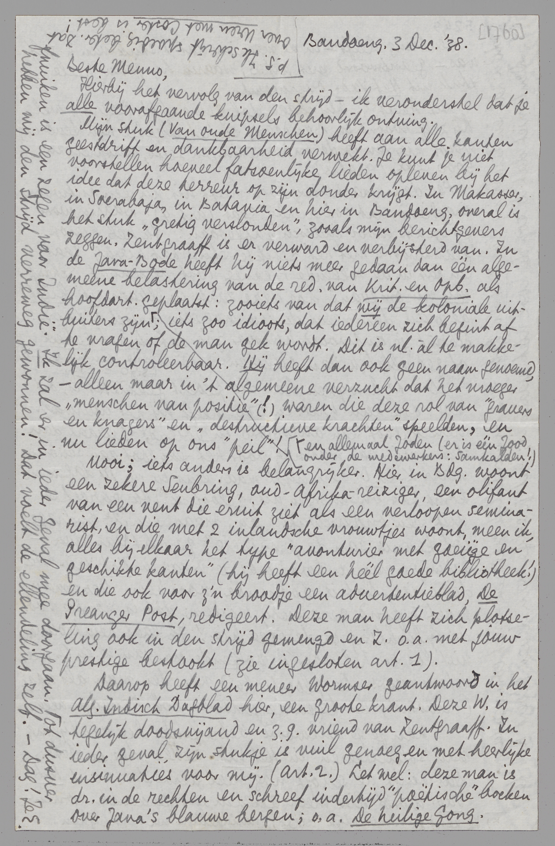 Mooi; iets anders is belangrijker. Hier in Bdg. woont een zekere Seubring, oud-Afrika-reiziger, een olifant van een vent die eruit ziet als een verloopen seminarist, en die met 2 inlandsche vrouwtjes woont, meen ik, alles bij elkaar het type ‘avonturier met goeiïge en geschikte kanten’ (hij heeft een héél goede bibliotheek!) en die ook voor z'n broodje een advertentieblad, De Preanger Post, redigeert. Deze man heeft zich plotseling ook in den strijd gemengd, en Z. o.a. met jouw prestige bestookt (zie ingesloten art. 1).