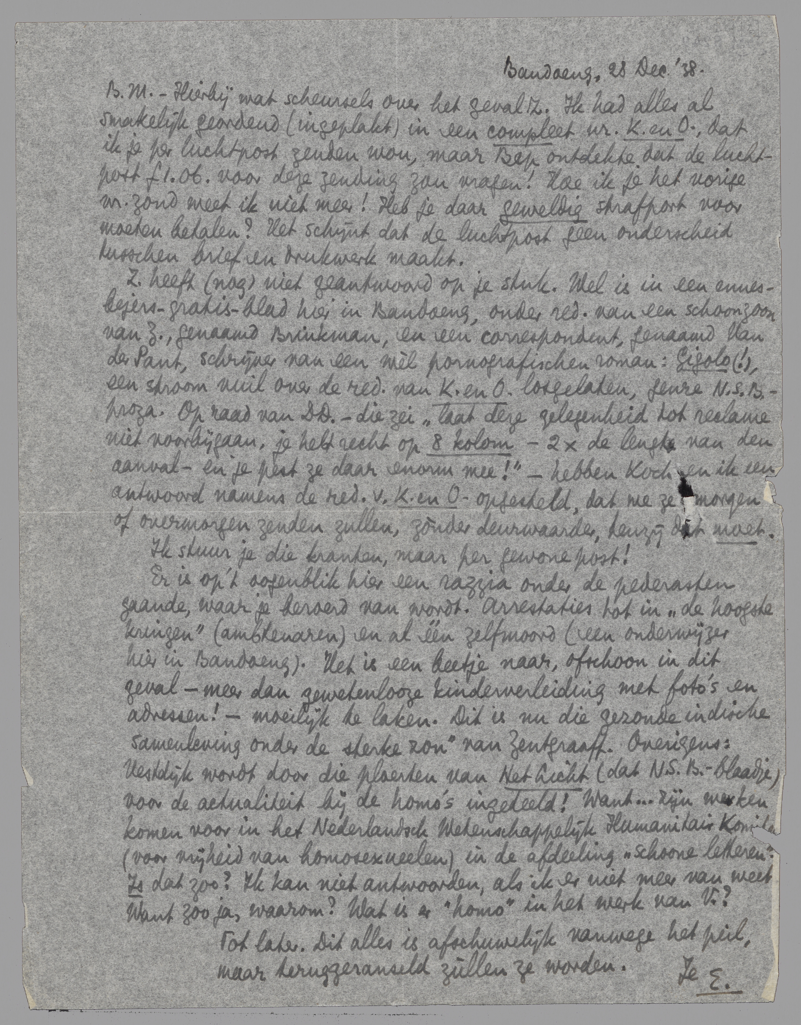 Er is op 't oogenblik hier een razzia onder de pederasten gaande, waar je beroerd van wordt. Arrestaties tot in ‘de hoogste kringen’ (ambtenaren) en al één zelfmoord (een onderwijzer hier in Bandoeng). Het is een beetje naar, ofschoon in dit geval - meer dan gewetenlooze kinderverleiding met foto's en adressen! - moeilijk te laken. Dit is nu die gezonde indische samenleving onder de ‘sterke zon’ van Zentgraaff. Overigens: Vestdijk wordt door die ploerten van Het Licht (dat N.S.B.-blaadje) voor de actualiteit bij de homo's ingedeeld! Want... zijn werken komen voor in het Nederlandsch Wetenschappelijk Humanitair Komitee (voor vrijheid van homosexueelen) in de afdeeling ‘schoone letteren’. Is dat zoo? Ik kan niet antwoorden, als ik er niet meer van weet. Want zoo ja, waarom? Wat is er ‘homo’ in het werk van V.?