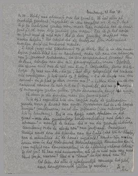 Z. heeft (nog) niet geantwoord op je stuk. Wel is in een ennesbejers-gratis-blad hier in Bandoeng, onder red. van een schoonzoon van Z., genaamd Brinkman, en een correspondent, genaamd Van der Pant, schrijver van een wèl pornografischen roman: Gigolo (!), een stroom vuil over de red. van K. en O. losgelaten, genre N.S.B.-proza. Op raad van D.D. - die zei ‘laat deze gelegenheid tot reclame niet voorbijgaan, je hebt recht op 8 kolom - 2 × de lengte van den aanval - en je pest ze daar enorm mee!’ - hebben Koch en ik een antwoord namens de red. van K. en O. opgesteld, dat we ze morgen of overmorgen zenden zullen, zònder deurwaarder, tenzij dat moet.