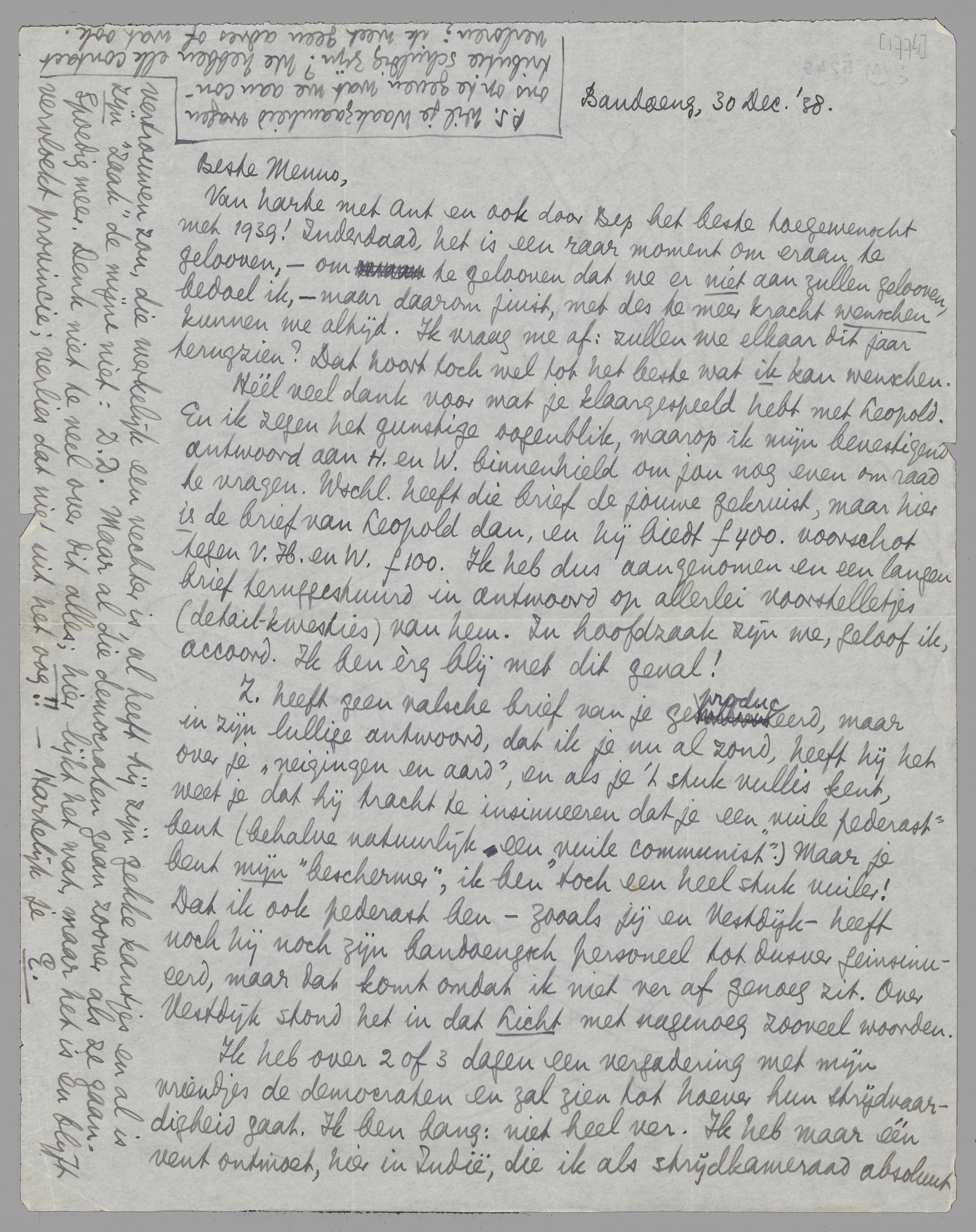 Ik heb over 2 of 3 dagen een vergadering met mijn vriendjes de democraten en zal zien tot hoever hun strijdvaardigheid gaat. Ik ben bang: niet heel ver. Ik heb maar één vent ontmoet, hier in Indië, die ik als strijdkameraad absoluut vertrouwen zou, die werkelijk een vechter is, al heeft hij zijn gekke kantjes en al is zijn ‘zaak’ de mijne niet: D.D. Maar al die democraten gaan zoover als ze gaan. Spoedig meer.