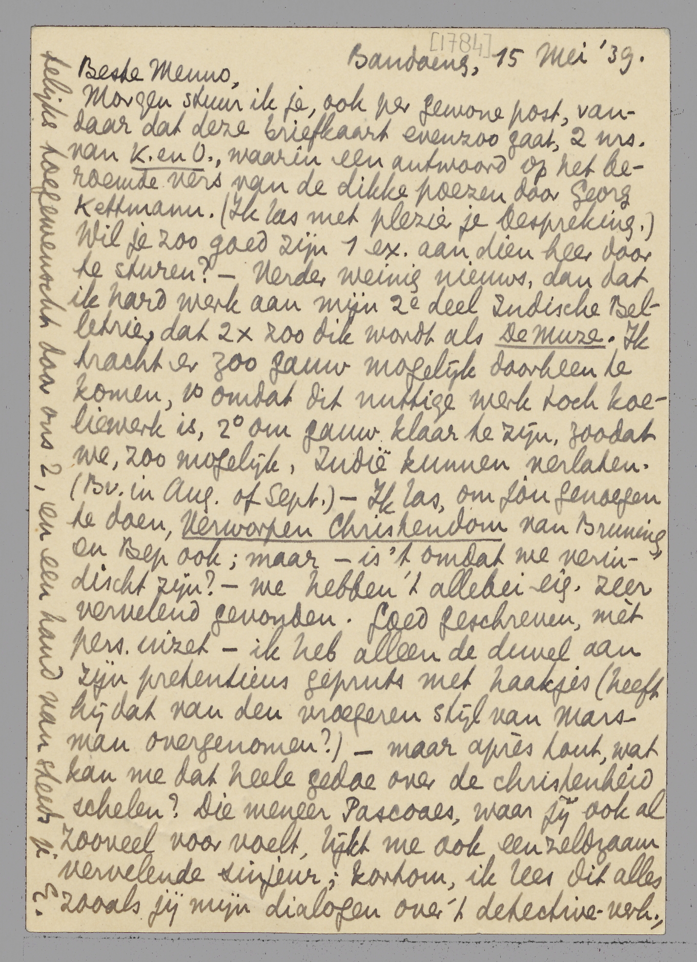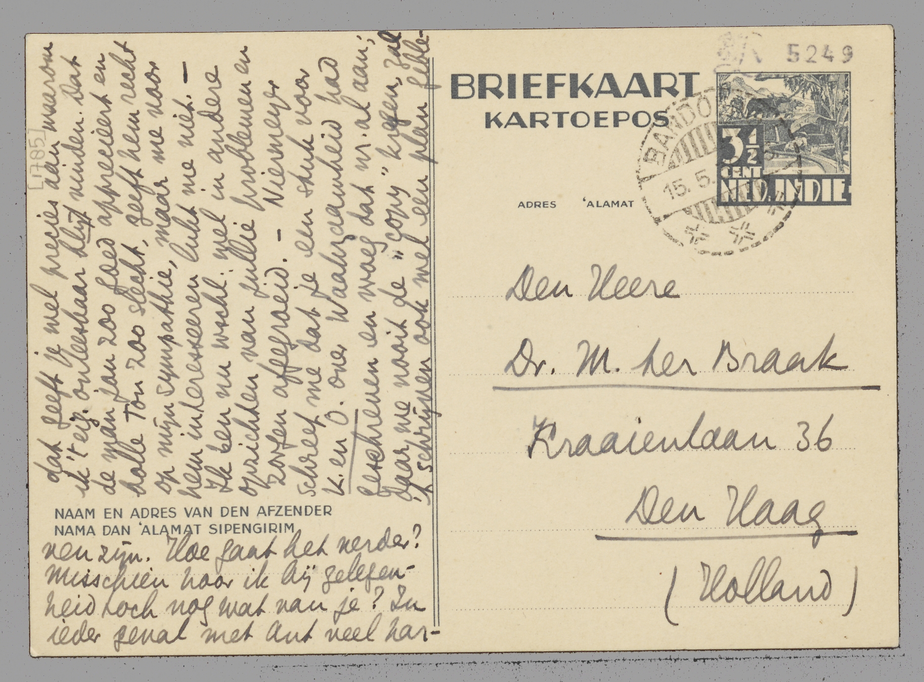 Morgen stuur ik je, ook per gewone post, vandaar dat deze briefkaart evenzoo gaat, 2 nrs. van K. en O., waarin een antwoord op het beroemde vers van de dikke poezen door Georg Kettmann. (Ik las met plezier je bespreking.) Wil je zoo goed zijn 1 ex. aan dien heer door te sturen? - Verder weinig nieuws, dan dat ik hard werk aan mijn 2e deel Indische Belletrie, dat 2 × zoo dik wordt als De Muze. Ik tracht er zoo gauw mogelijk doorheen te komen, 1o omdat dit nuttige werk toch koeliewerk is, 2o om gauw klaar te zijn, zoodat we, zoo mogelijk, Indië kunnen verlaten. (Bv. in Aug. of Sept.) - Ik las, om jou genoegen te doen, Verworpen Christendom van Bruning, en Bep ook; maar - is 't omdat we verindischt zijn? - we hebben 't allebei eig. zeer vervelend gevonden. Goed geschreven, mèt pers. inzet - ik heb alleen de duvel aan zijn pretentieus gepruts met haakjes (heeft hij dat van den vroegeren stijl van Marsman overgenomen?) - maar après tout, wat kan me dat heele gedoe over de christenheid schelen? Die meneer Pascoaes, waar jij ook al zooveel voor voelt, lijkt me ook een zeldzaam vervelende sinjeur; kortom, ik lees dit alles zooals jij mijn dialogen over 't detective-verh., dat geeft je wel precies aan waarom ik 't eig. onleesbaar blijf vinden. Dat de man jou zoo goed apprecieert en bolle Ton zoo slecht, geeft hem recht op mijn sympathie, maar me voor hem interesseeren lukt me niet. - Ik ben nu wschl. wel in andere opzichten van jullie problemen en zorgen afgegroeid. - Niermeyer schreef me dat je een stuk voor K. en O. over Waakzaamheid had geschreven en vroeg dat nr. al aan; daar we nooit de ‘copy’ kregen, zal 't schrijven ook wel een plan gebleven zijn. Hoe gaat het verder? Misschien hoor ik bij gelegenheid toch nog wat van je? In ieder geval met Ant veel hartelijks toegewenscht door ons 2, en een hand van steeds je