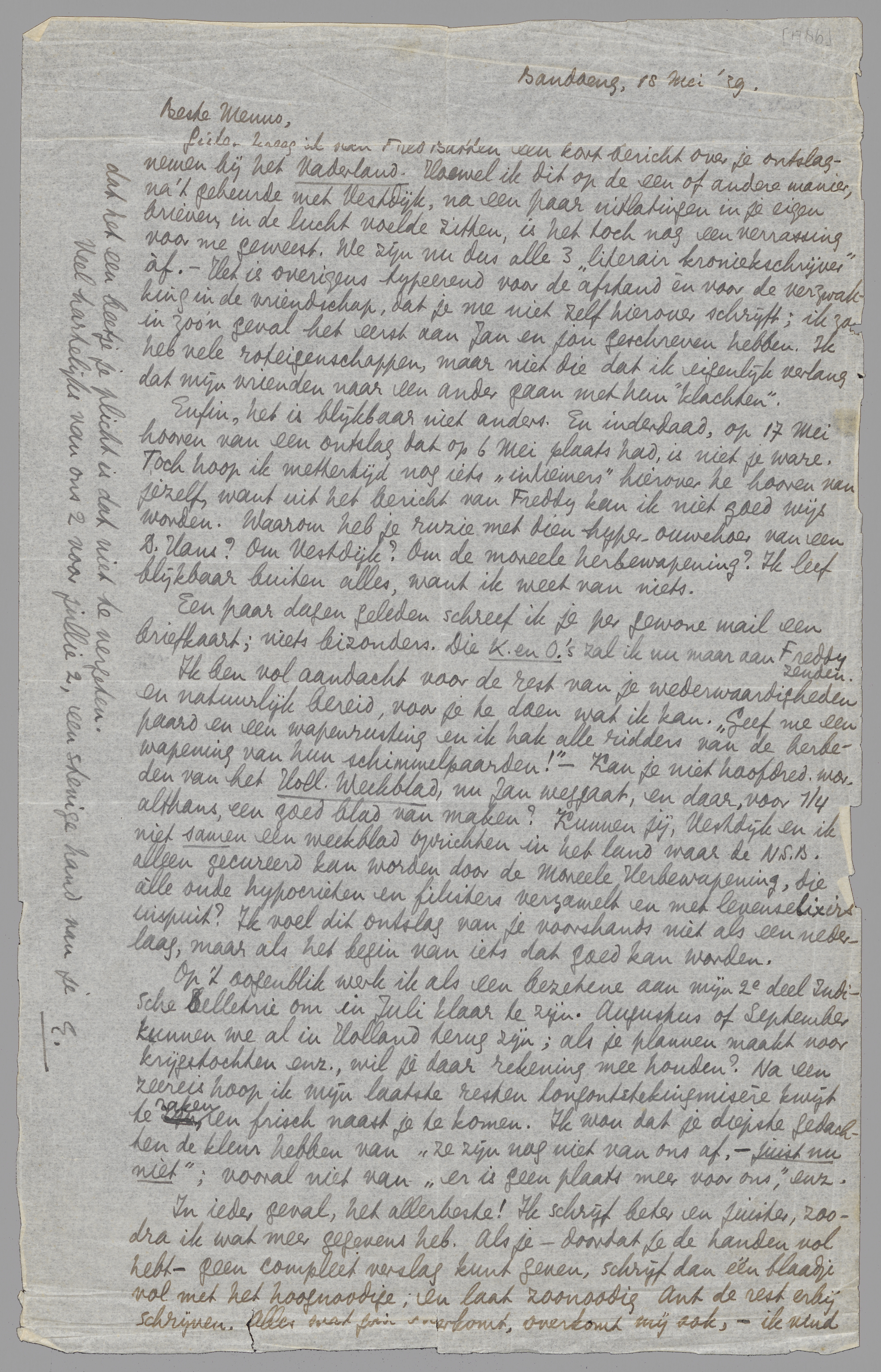 Op 't oogenblik werk ik als een bezetene aan mijn 2e deel Indische Belletrie om in Juli klaar te zijn. Augustus of September kunnen we al in Holland terug zijn; als je plannen maakt voor krijgstochten enz., wil je daar rekening mee houden? Na een zeereis hoop ik mijn laatste resten longontstekingsmisère kwijt te raken en frisch naast je te komen. Ik wou dat je diepste gedachten de kleur hebben van ‘ze zijn nog niet van ons af, - juist nu niet’; vooral niet van ‘er is geen plaats meer voor ons’, enz. In ieder geval, het allerbeste! Ik schrijf beter en juister, zoodra ik wat meer gegevens heb. Als je - doordat je de handen vol hebt - geen compleet verslag kunt geven, schrijf dan één blaadje vol met het hoognoodige; en laat zoonoodig Ant de rest erbij schrijven. Alles wat jou overkomt, overkomt mij ook, - ik vind dat het een beetje je plicht is dat niet te vergeten.
