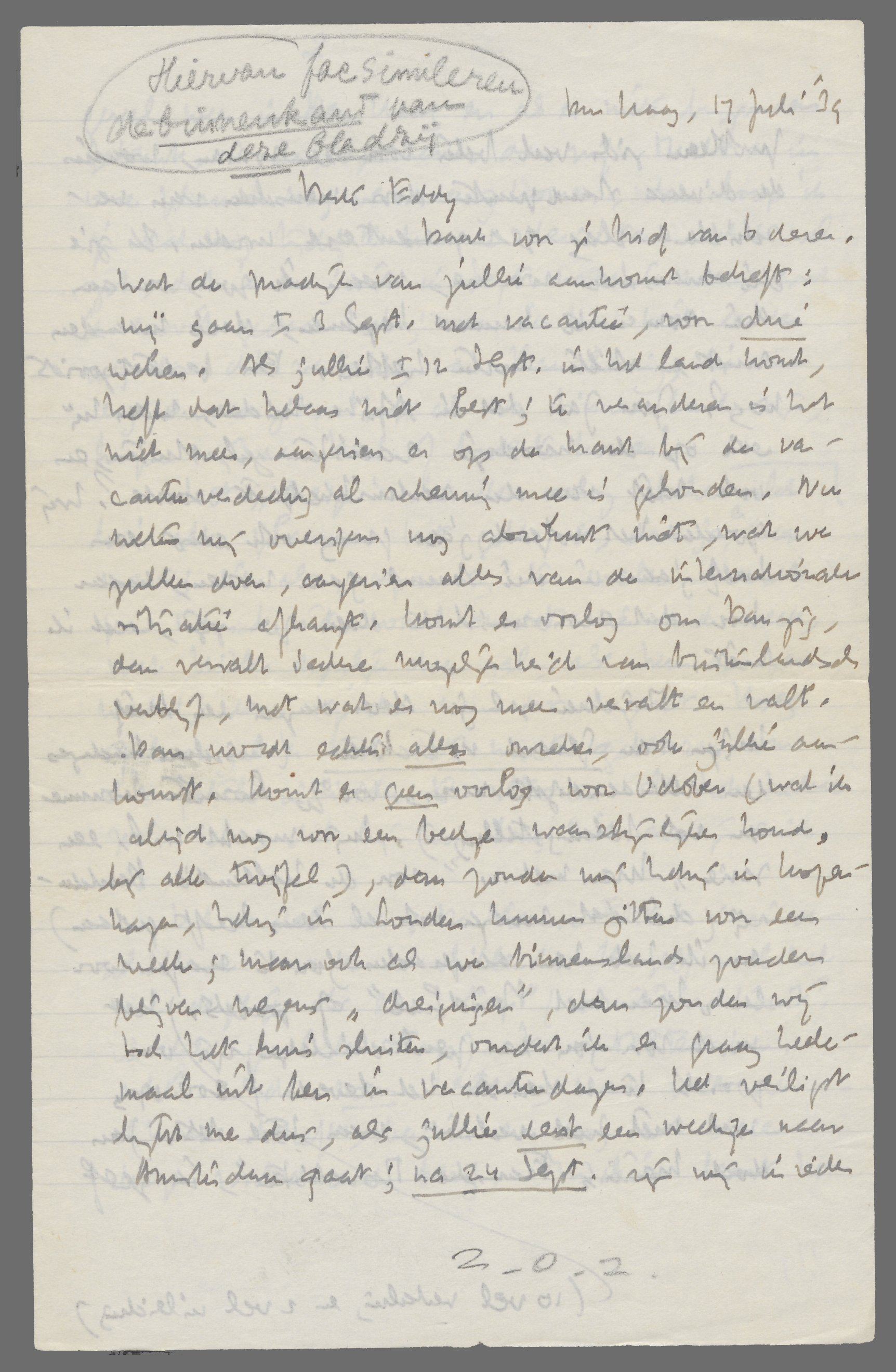 Dank voor je brief van 6 dezer. Wat de practijk van jullie aankomst betreft: wij gaan ± 3 Sept. met vacantie, voor drie weken. Als jullie ± 12 Sept. in het land komt, treft dat helaas niet best; te veranderen is het niet meer, aangezien er op de krant bij de vacantie verdeeling al rekening mee is gehouden. Nu weten wij overigens nog absoluut niet, wat we zullen doen, aangezien alles van de internationale situatie afhangt. Komt er oorlog om Danzig, dan vervalt iedere mogelijkheid van buitenlandsch verblijf, met wat er nog meer vervalt en valt. Dan wordt echter alles onzeker, ook jullie aankomst. Komt er geen oorlog voor October (wat ik altijd nog voor een beetje waarschijnlijker houd, bij alle twijfel), dan zouden wij hetzij in Kopenhagen, hetzij in Londen kunnen zitten voor een week; maar ook als we binnenslands zouden blijven wegens ‘dreigingen’, dan zouden wij toch het huis sluiten, omdat ik er graag heelemaal uit ben in vacantiedagen. Het veiligst lijkt me dus, als jullie eerst een weekje naar Amsterdam gaat; na 24 Sept. zijn wij in ieder geval weer in Den Haag en als er niets bijzonders gebeurt, is de logeerkamer dan vrij. Mocht er in onze plannen nog verandering komen, dan hoop ik je dat nog tijdig te kunnen berichten. Het is wel rot, dat ik nu juist in Sept. vacantie neem, wat ik nooit gedaan heb; maar ik kan niet eerder weg door die vertaling van Rauschning, die me erg dwars zit. Maar als we binnenslands zijn, hopen wij aan trein of boot te komen!