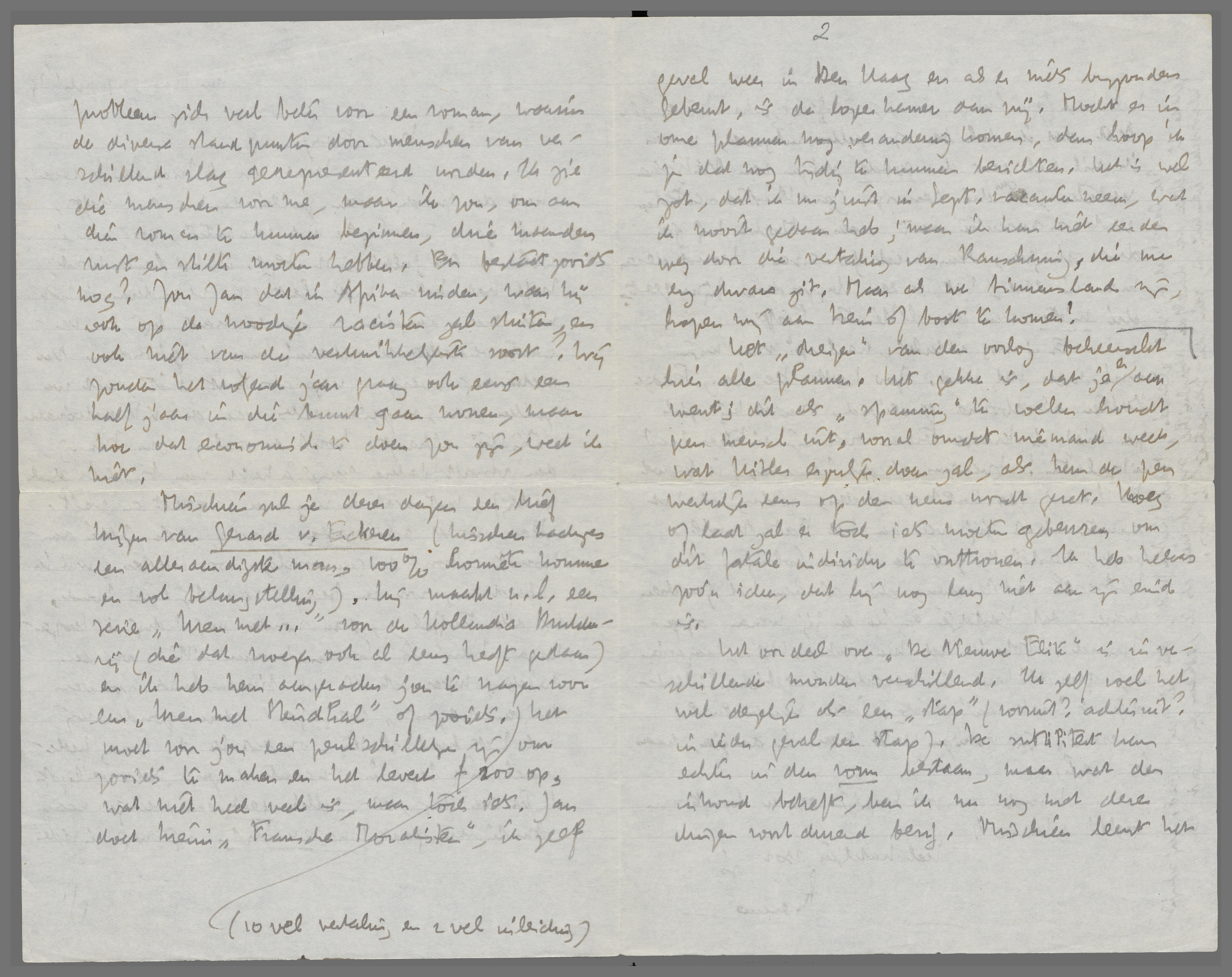 Het oordeel over De Nieuwe Elite is in verschillende monden verschillend. Ik zelf voel het wel degelijk als een ‘stap’ (vooruit? achteruit? in ieder geval een stap). De subtiliteit kan echter in den vorm bestaan, maar wat den inhoud betreft, ben ik nu nog met deze dingen voortdurend bezig. Misschien leent het probleem zich veel beter voor een roman, waarin de diverse standpunten door menschen van verschillend slag gerepresenteerd worden. Ik zie die menschen voor me, maar ik zou, om aan die roman te kunnen beginnen, drie maanden rust en stilte moeten hebben. En bestaat zooiets nog? Zou Jan dat in Afrika vinden, waar hij ook op de noodige racisten zal stuiten, en ook niet van de verkwikkelijkste soort? Wij zouden het volgend jaar graag ook eens een half jaar in die buurt gaan wonen, maar hoe dat economisch te doen zou zijn, weet ik niet.