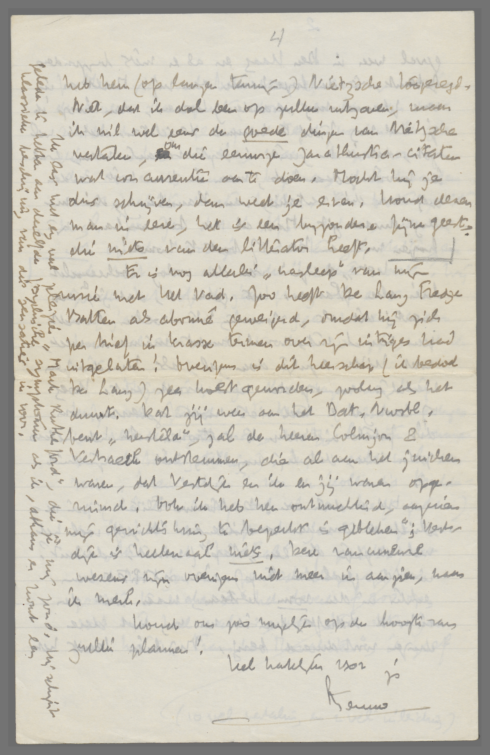 Misschien zul je dezer dagen een brief krijgen van Gerard v. Eckeren (tusschen haakjes een alleraardigste man, 100 % honnête homme en vol belangstelling). Hij maakt n.l. een serie ‘Uren met…’ voor de Hollandia Drukkerij (die dat vroeger ook al eens heeft gedaan) en ik heb hem aangeraden jou te vragen voor een ‘Uren met Stendhal’ of zooiets. (10 vel vertaling en 2 vel inleiding) Het moet voor jou een peulschilletje zijn om zooiets te maken en het levert f200 op, wat niet heel veel is, maar toch iets. Jan doet hierin ‘Fransche moralisten’, ik zelf heb hem (op lange termijn) Nietzsche toegezegd. Niet, dat ik dol ben op zulke uitgaven, maar ik wil wel eens de goede dingen van Nietzsche vertalen, om die eeuwige Zarathustra-citaten wat concurrentie aan te doen. Mocht hij je dus schrijven, dan weet je ervan. Houdt dezen man in eere, het is een bijzondere fijne geest, die niets van den litterator heeft.