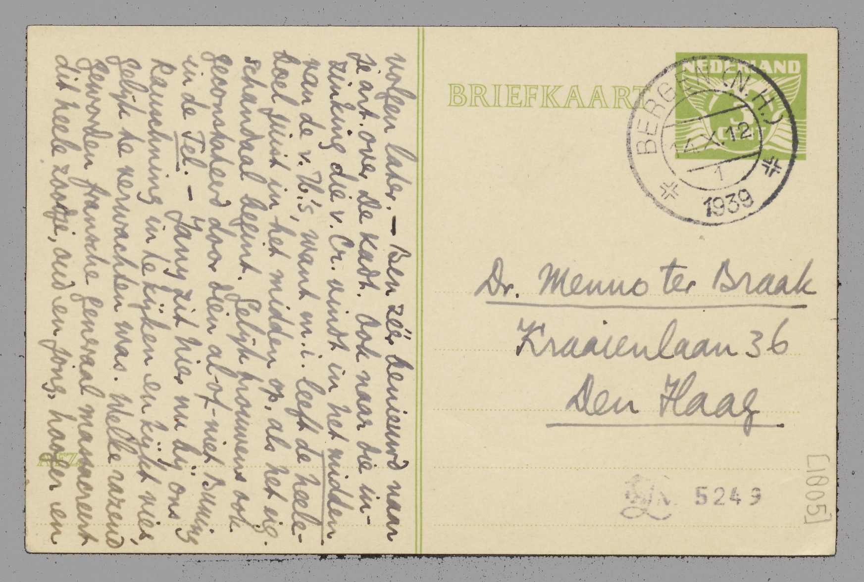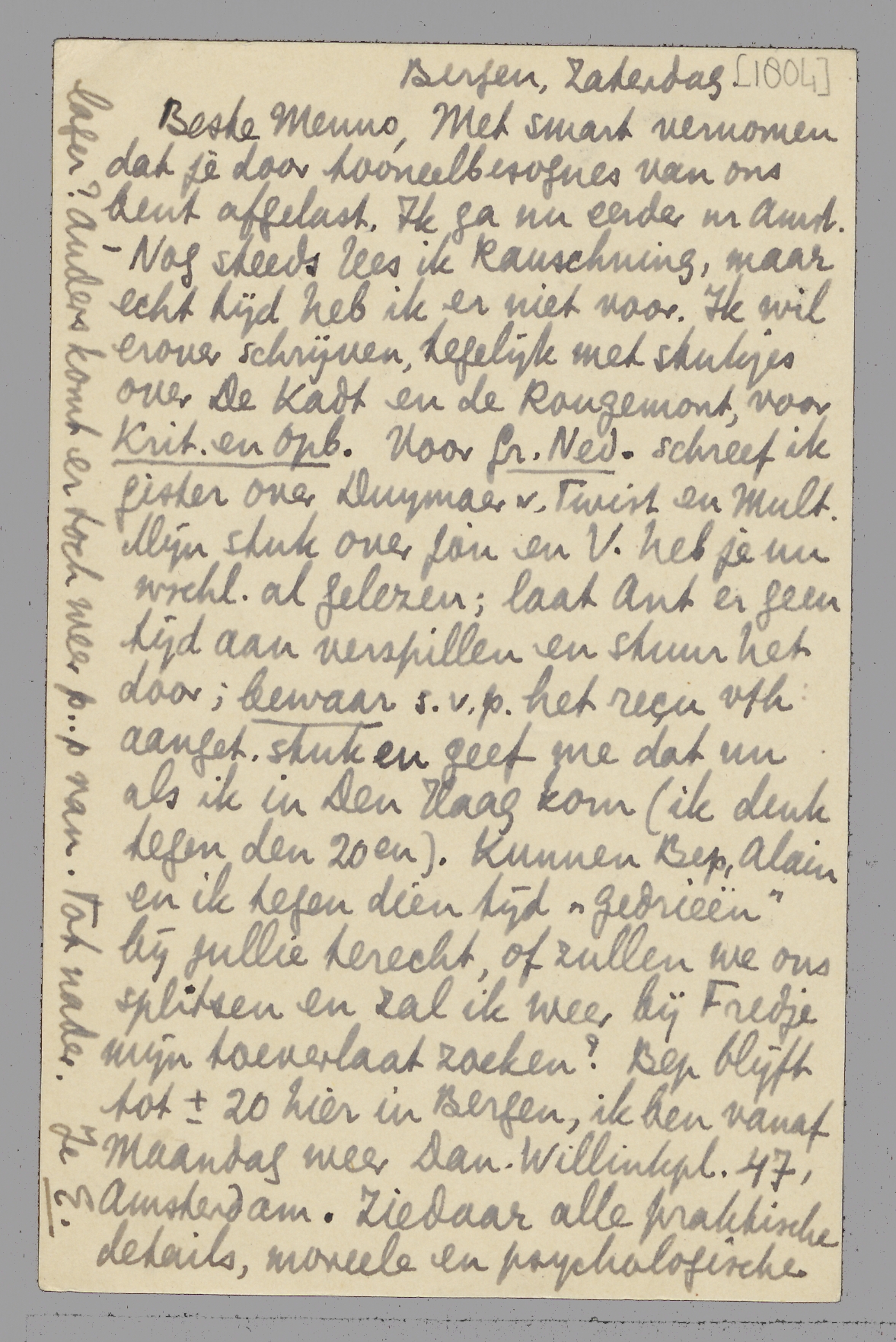 Met smart vernomen dat je door tooneelbesognes van ons bent afgelast. Ik ga nu eerder nr Amst. - Nog steeds lees ik Rauschning, maar echt tijd heb ik er niet voor. Ik wil erover schrijven, tegelijk met stukjes over De Kadt en de Rougemont, voor Krit. en Opb. Voor Gr.Ned. schreef ik gister over Duymaer v.Twist en Mult. Mijn stuk over jou en V. heb je nu wschl. al gelezen; laat Ant er geen tijd aan verspillen en stuur het door; bewaar s.v.p. het reçu v/h aanget. stuk en geef me dat nu als ik in Den Haag kom (ik denk tegen den 20en). Kunnen Bep, Alain en ik tegen dien tijd ‘gedrieën’ bij jullie terecht, of zullen we ons splitsen en zal ik weer bij Fredje mijn toeverlaat zoeken? Bep blijft tot ± 20 hier in Bergen, ik ben vanaf Maandag weer Dan. Willinkplein 47, Amsterdam. Ziedaar alle praktische details, moreele en psychologische volgen later.