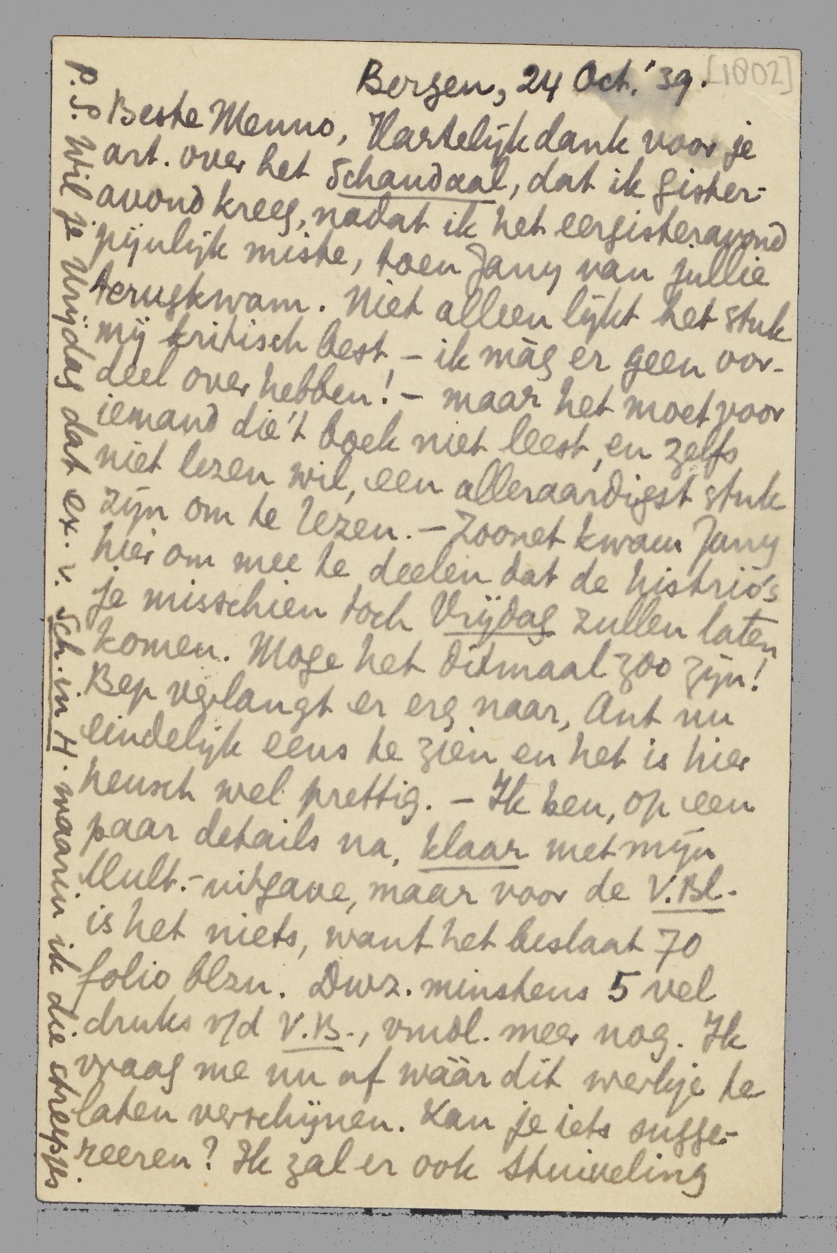 P.S. Wil je Vrijdag dat ex. v. Sch. in H. waarin ik die streepjes zette, hierheen meenemen?