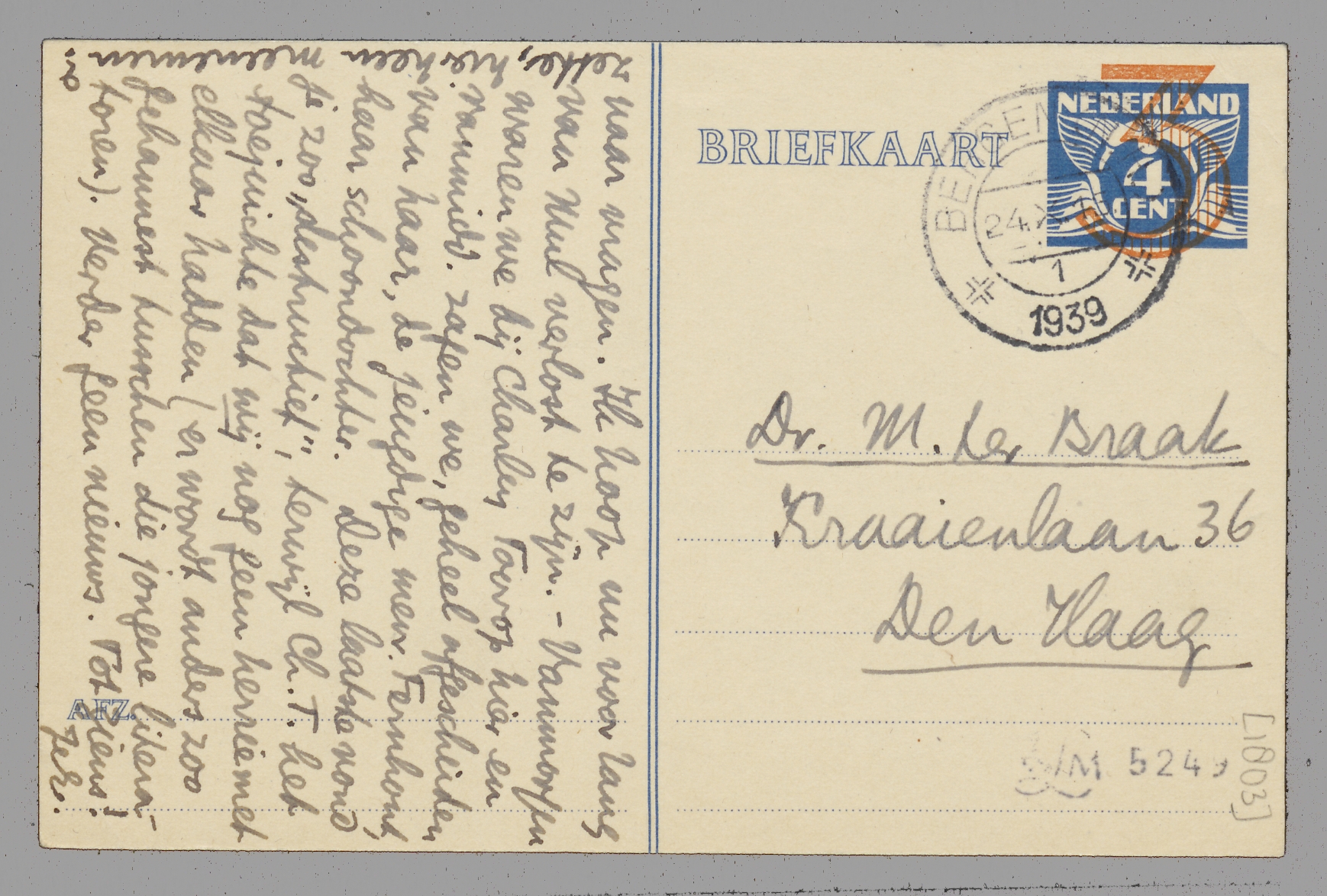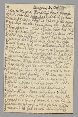 Hartelijk dank voor je art. over het Schandaal, dat ik gisteravond kreeg, nadat ik het eergisteravond pijnlijk miste, toen Jany van jullie terugkwam. Niet alleen lijkt het stuk mij kritisch best - ik màg er geen oordeel over hebben! - maar het moet voor iemand die 't boek niet leest, en zelfs niet lezen wil, een alleraardigst stuk zijn om te lezen. - Zoonet kwam Jany hier om mee te deelen dat de histrio's je misschien toch Vrijdag zullen laten komen. Moge het ditmaal zoo zijn! Bep verlangt er erg naar, Ant nu eindelijk eens te zien en het is hier heusch wel prettig. - Ik ben, op een paar details na, klaar met mijn Mult.- uitgave, maar voor de V. Bl. is het niets, want het beslaat 70 folio blzn. Dwz. minstens 5 vel druks v/d V.B., vmdl. meer nog. Ik vraag me nu af wààr dit werkje te laten verschijnen. Kan je iets suggereeren? Ik zal er ook Stuiveling naar vragen. Ik hoop nu voor lang van Mul. verlost te zijn. - Vanmorgen waren we bij Charley Toorop hier en vanmidd. zagen we, geheel afgescheiden van haar, de jeugdige mevr. Fernhout, haar schoondochter. Deze laatste vond je zoo ‘destructief’, terwijl Ch.T. het toejuichte dat wij nog geen herrie met elkaar hadden (er wordt anders zoo gehannest tusschen die jongere literatoren). Verder geen nieuws. Tot ziens!