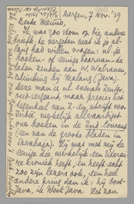 Ik was zoo stom op die andere briefk. te vergeten wat ik je allang had willen vragen: nl. je boeken - of eenige daarvan - te laten zenden aan W. Walraven, Blimbing bij Malang (Java).