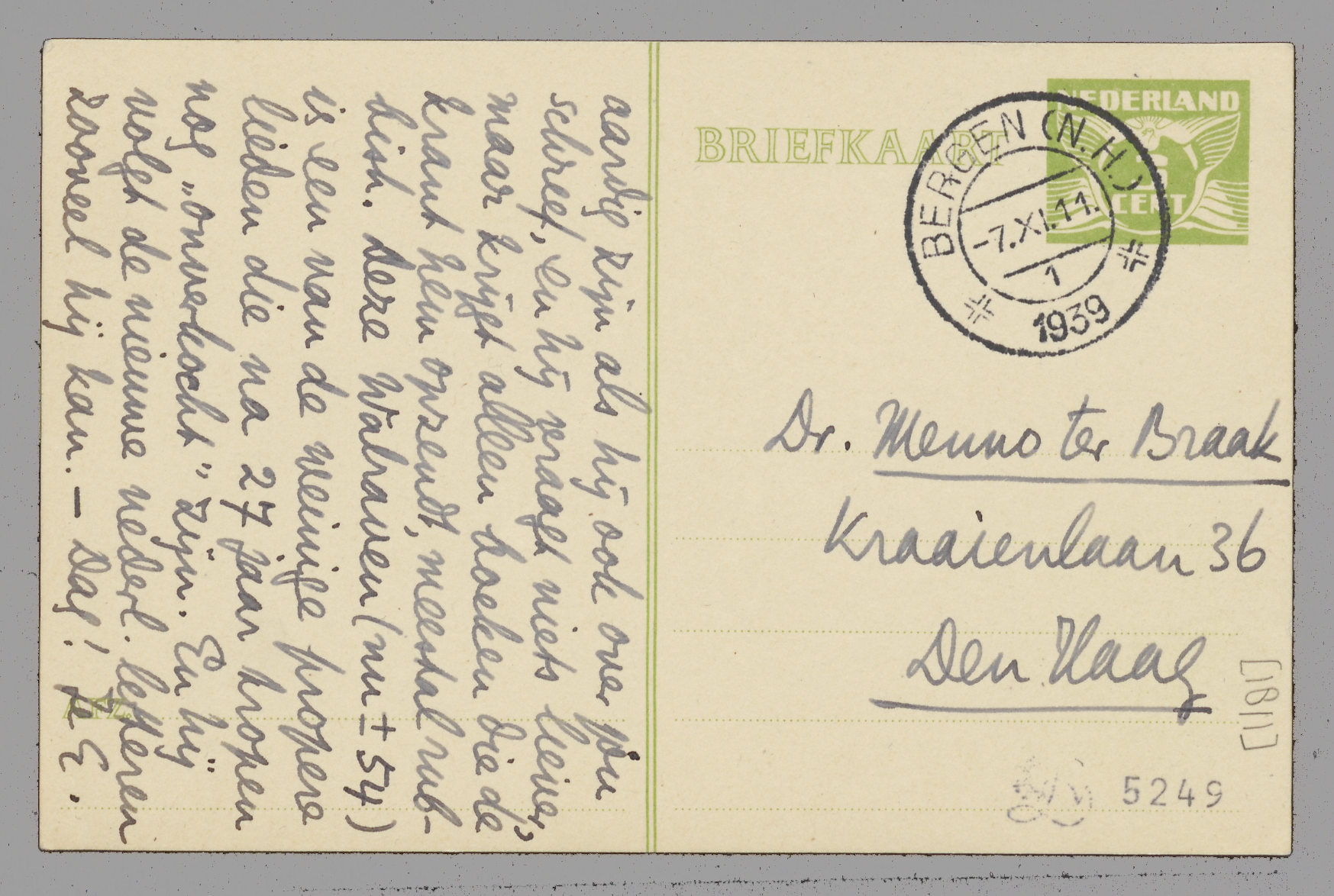 Deze man is nl. evenals Zentgr. oud-sergeant, maar precies het tegendeel van Z. en schrijft voor Indië werkelijk alleraardigst over boeken in de Ind. Courant (een van de groote bladen in Soerabaja). Hij was met mij de eenige die werkelijk een literaire kroniek heeft, en heeft echt zoo zijn lezers ook, een heel andere kring dan ik: hij Oost-Java, ik West-Java. Het zou aardig zijn als hij ook over jou schreef, en hij vraagt niets liever, maar krijgt alleen boeken die de krant hem opzendt, meestal rubbish. Deze Walraven (nu ± 54) is een van de weinige propere lieden die na 27 jaren tropen nog ‘onverkocht’ zijn. En hij volgt de nieuwe nederl. letteren zooveel hij kan. - Dag!