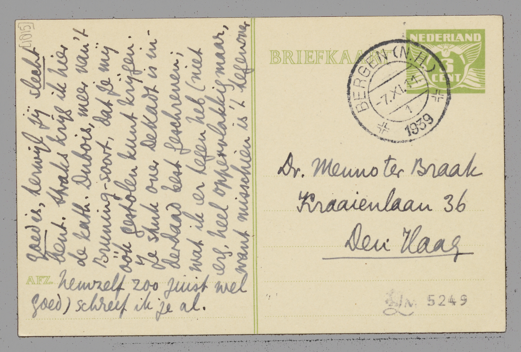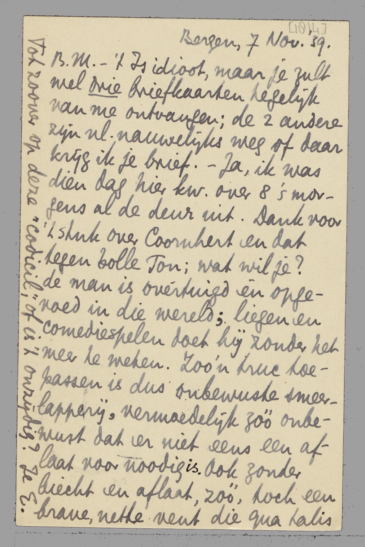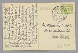 't Is idioot, maar je zult wel drie briefkaarten tegelijk van me ontvangen; de 2 andere zijn nl. nauwelijks weg of daar krijg ik je brief. - Ja, ik was dien dag hier kw. over 8 's morgens al de deur uit. Dank voor 't stuk over Coornhert en dat tegen bolle Ton; wat wil je? de man is overtuigd èn opgevoed in die wereld; liegen en comediespelen doet hij zonder het meer te weten. Zoo'n truc toepassen is dus onbewuste smeerlapperij, vermoedelijk zóó onbewust dat er niet eens een aflaat voor noodig is. Ook zonder biecht en aflaat, zóó, toch een brave, nette vent die qua talis goed is, terwijl jij slecht bent. Straks krijg ik hier de kath. Dubois, meer van 't Bruning-soort, dat je mij óók gestolen kunt krijgen. Je stuk over De Kadt is inderdaad best geschreven; wat ik er tegen heb (niet erg, heel oppervlakkig maar, want misschien is 't tegenover hemzelf zoo juist wel goed) schreef ik je al. Tot zoover op deze ‘codicil’, of is 't onzijdig?