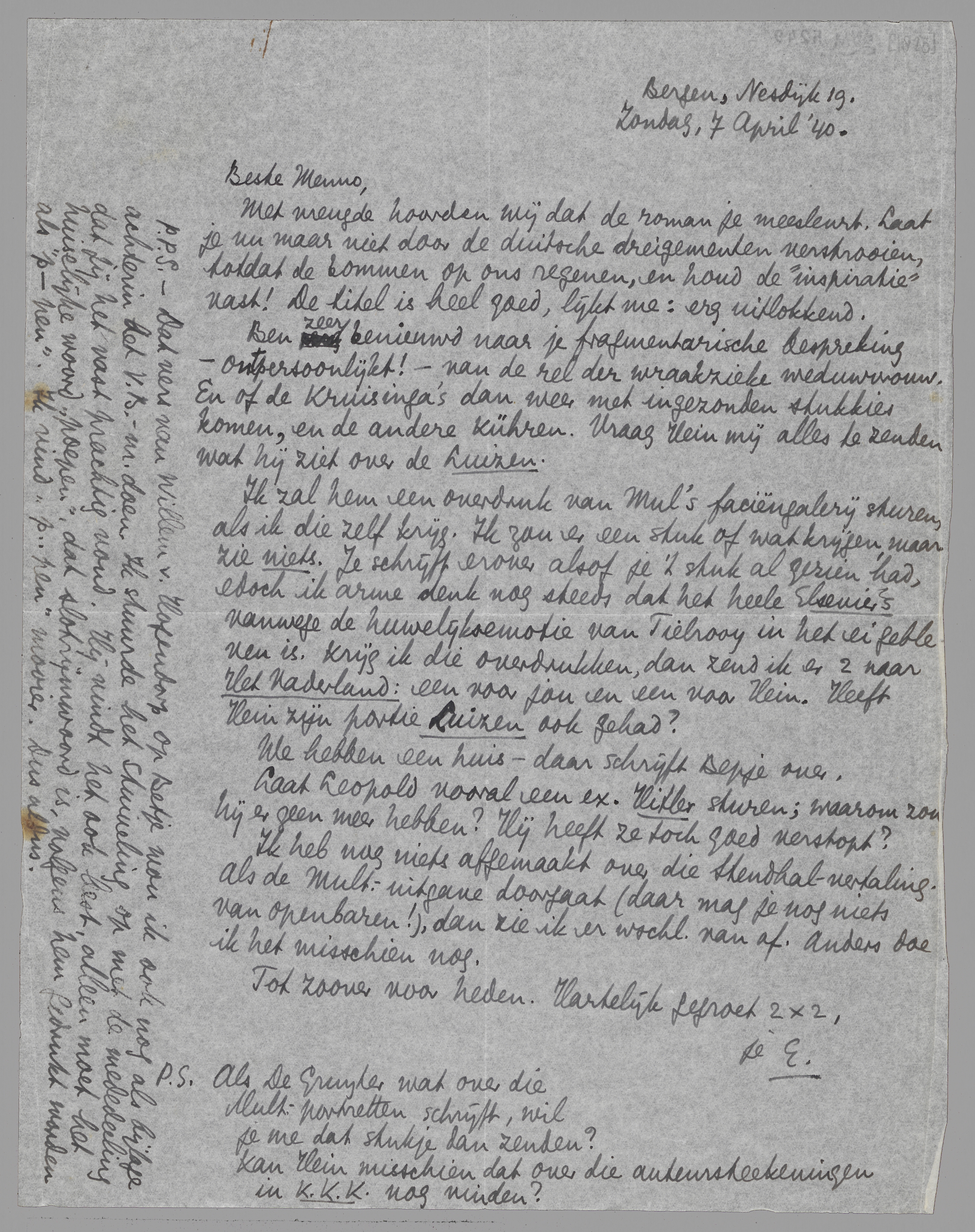P.S. Als de Gruyter wat over die Mult. portretten schrijft, wil je me dat stukje dan zenden? Kan Hein misschien dat over die auteursteekeningen in K.K.K. nog vinden?