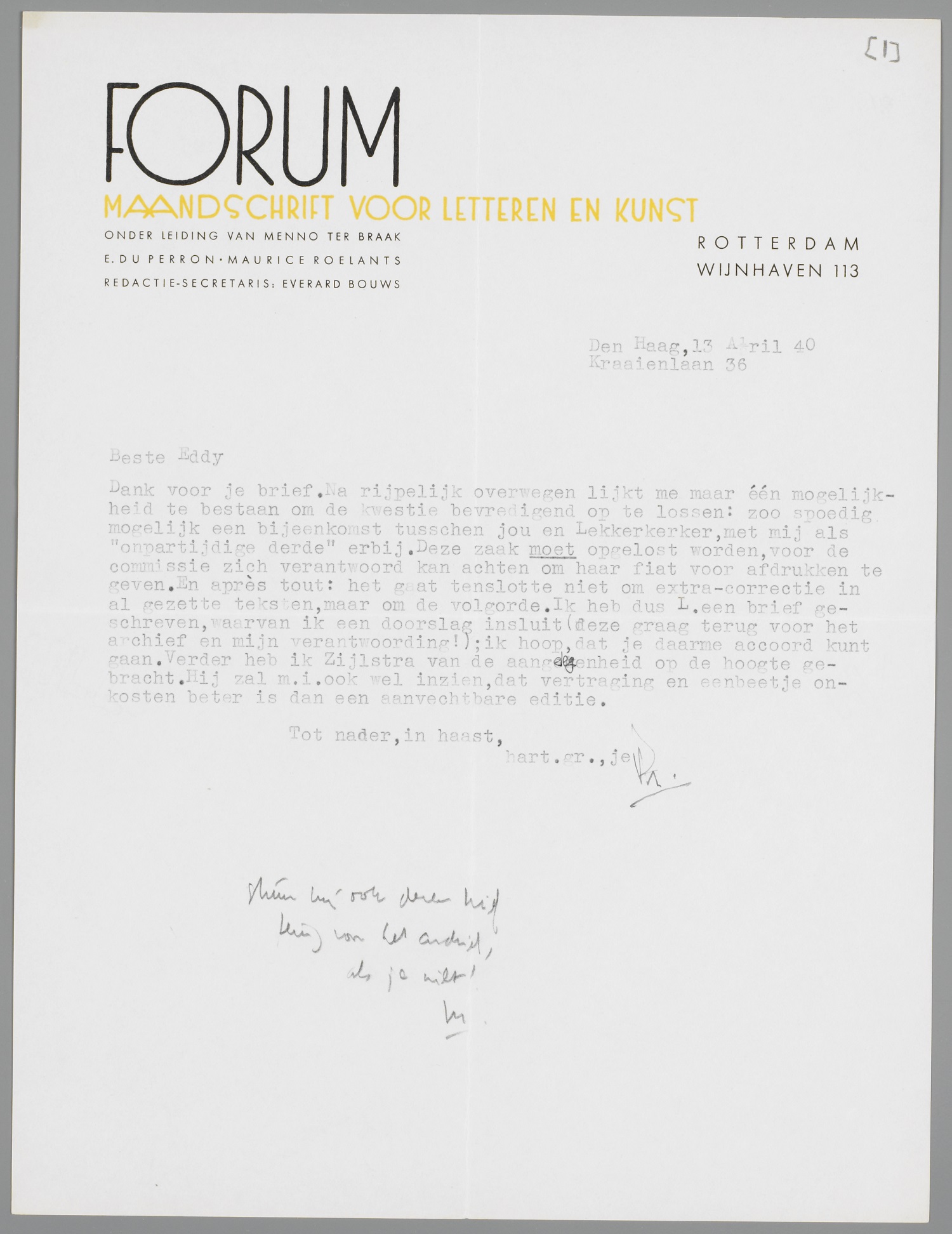 Dank voor je brief. Na rijpelijk overwegen lijkt me maar één mogelijkheid te bestaan om de kwestie bevredigend op te lossen: zoo spoedig mogelijk een bijeenkomst tusschen jou en Lekkerkerker, met mij als ‘onpartijdige derde’ erbij. Deze zaak moet opgelost worden, voor de commissie zich verantwoord kan achten om haar fiat voor afdrukken te geven. En après tout: het gaat tenslotte niet om extra-correctie in al gezette teksten, maar om de volgorde. Ik heb dus L. een brief geschreven, waarvan ik een doorslag insluit (deze graag terug voor het archief en mijn verantwoording!); ik hoop, dat je daarmee accoord kunt gaan. Verder heb ik Zijlstra van de aangelegenheid op de hoogte gebracht. Hij zal m.i. ook wel inzien, dat vertraging en een beetje onkosten beter is dan een aanvechtbare editie.