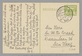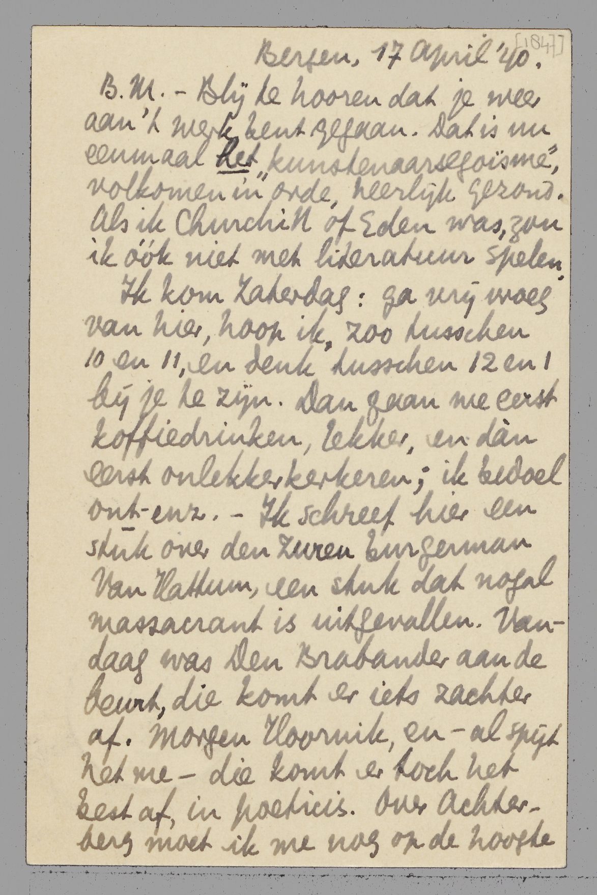 Ik kom Zaterdag: ga vrij vroeg van hier, hoop ik, zoo tusschen 10 en 11, en denk tusschen 12 en 1 bij je te zijn. Dan gaan we eerst koffiedrinken, lekker, en dàn eerst onlekkerkerkeren; ik bedoel ont-enz. - Ik schreef hier een stuk over den zuren burgerman Van Hattum, een stuk dat nogal massacrant is uitgevallen. Vandaag was Den Brabander aan de beurt, die komt er iets zachter af. Morgen Hoornik, en - al spijt het me - die komt er toch het best af, in poeticis. Over Achterberg moet ik me nog op de hoogte stellen. Ik vind dit werk stierlijk onaangenaam.