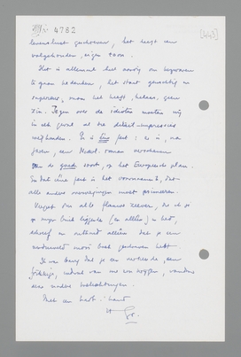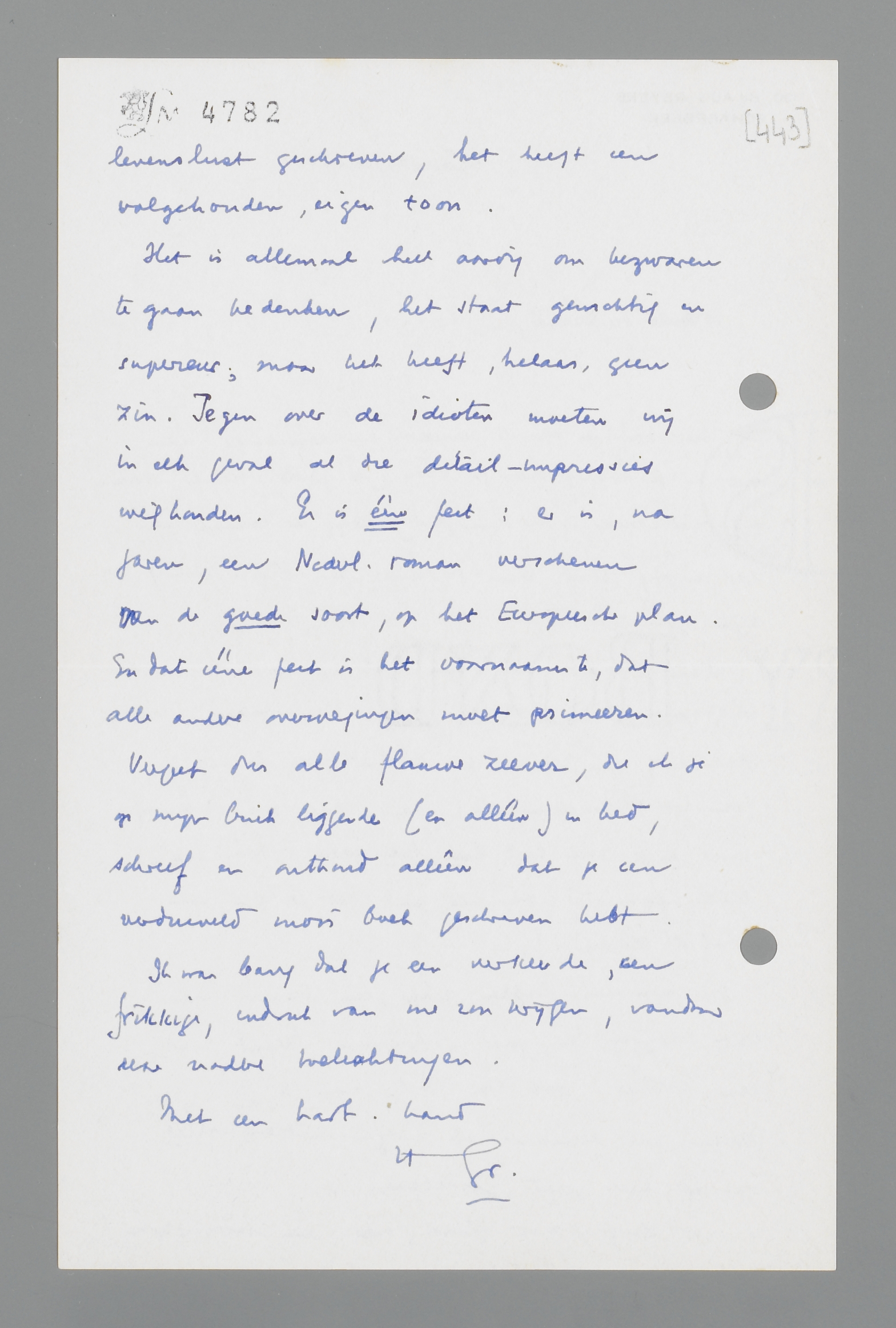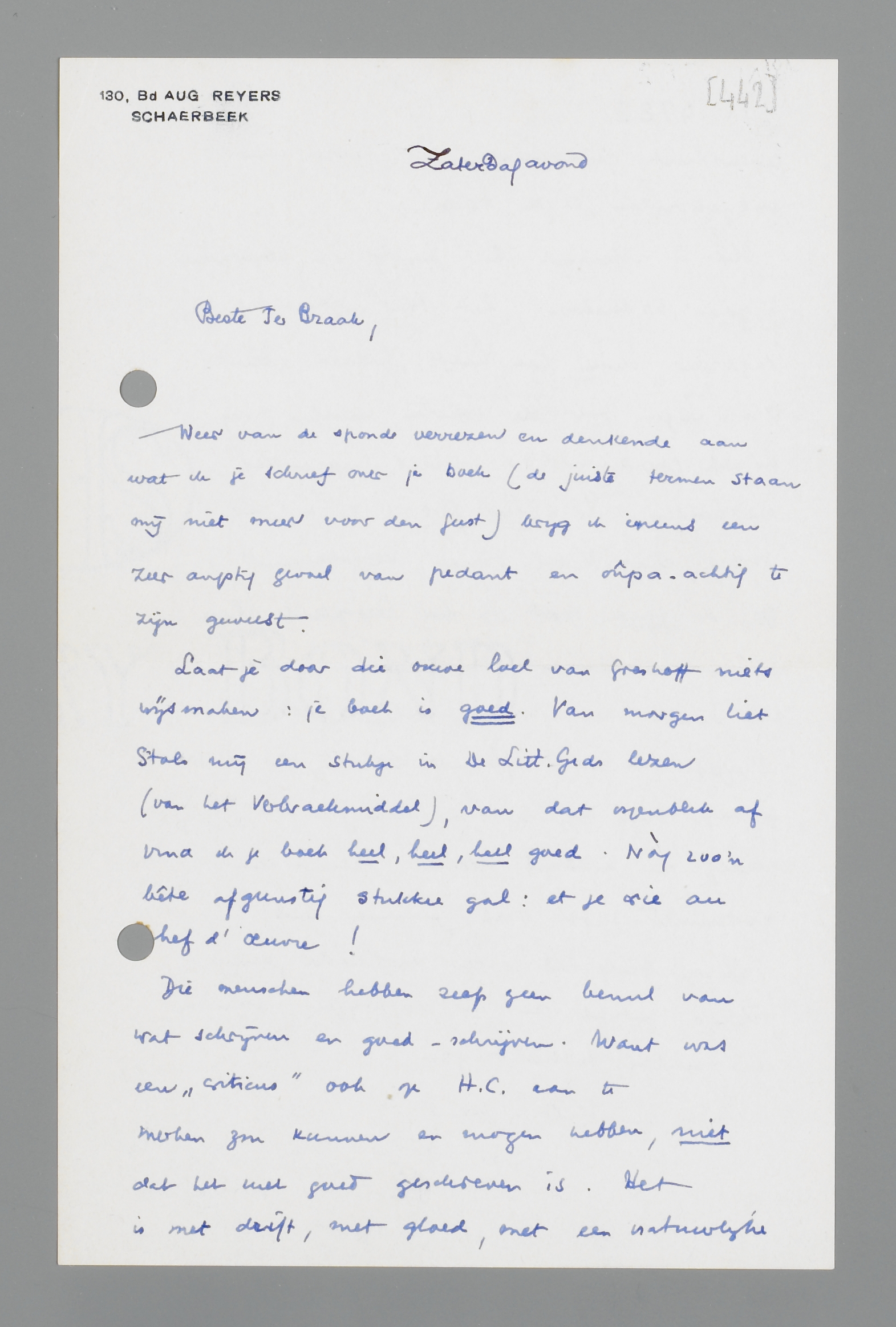 Laat je door die ouwe hoed[?] van Greshoff niets wijsmaken: je boek is goed. Van morgen liet Stols mij een stukje in De Litt. Gids lezen (van het Verbraekmiddel), van dat oogenblik af vind ik je boek heel, heel, heel goed. Nòg zoo'n bête afgunstig stukkie gal: et je crie au chef d'oeuvre!