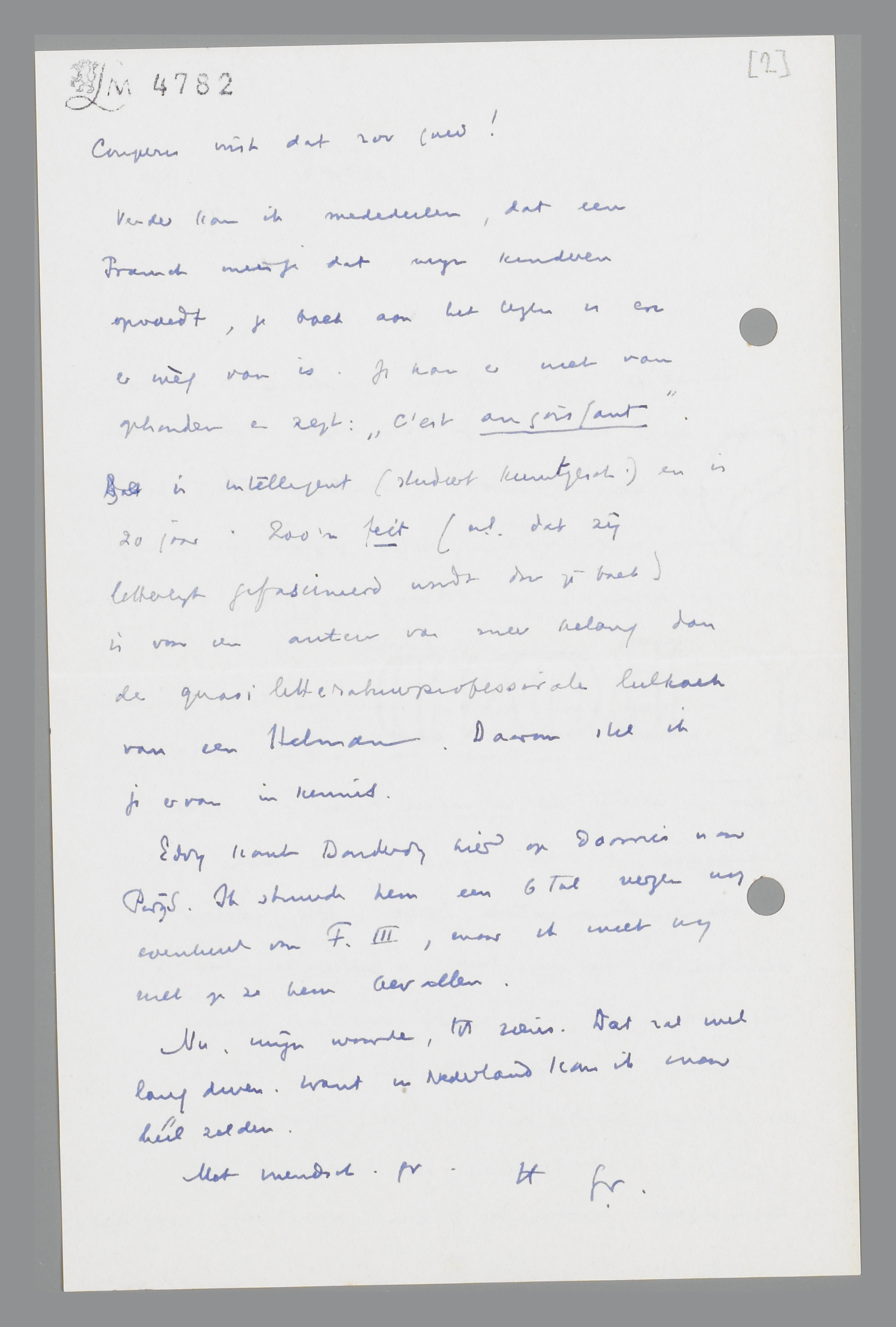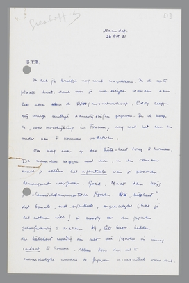 Verder kan ik mededeelen, dat een Fransch meisje dat mijn kinderen opvoedt, je boek aan het lezen is en er wèg van is. Ze kan er niet van ophouden en zegt: ‘C'est angoissant’. Ze is intelligent (studeert kunstgesch.) en is 20 jaar. Zoo'n feit (n.l. dat zij letterlijk gefascineerd wordt door je boek) is voor een auteur van meer belang dan de quasi litteratuurprofessoriale lulkoek van een Helman. Daarom stel ik je ervan in kennis.