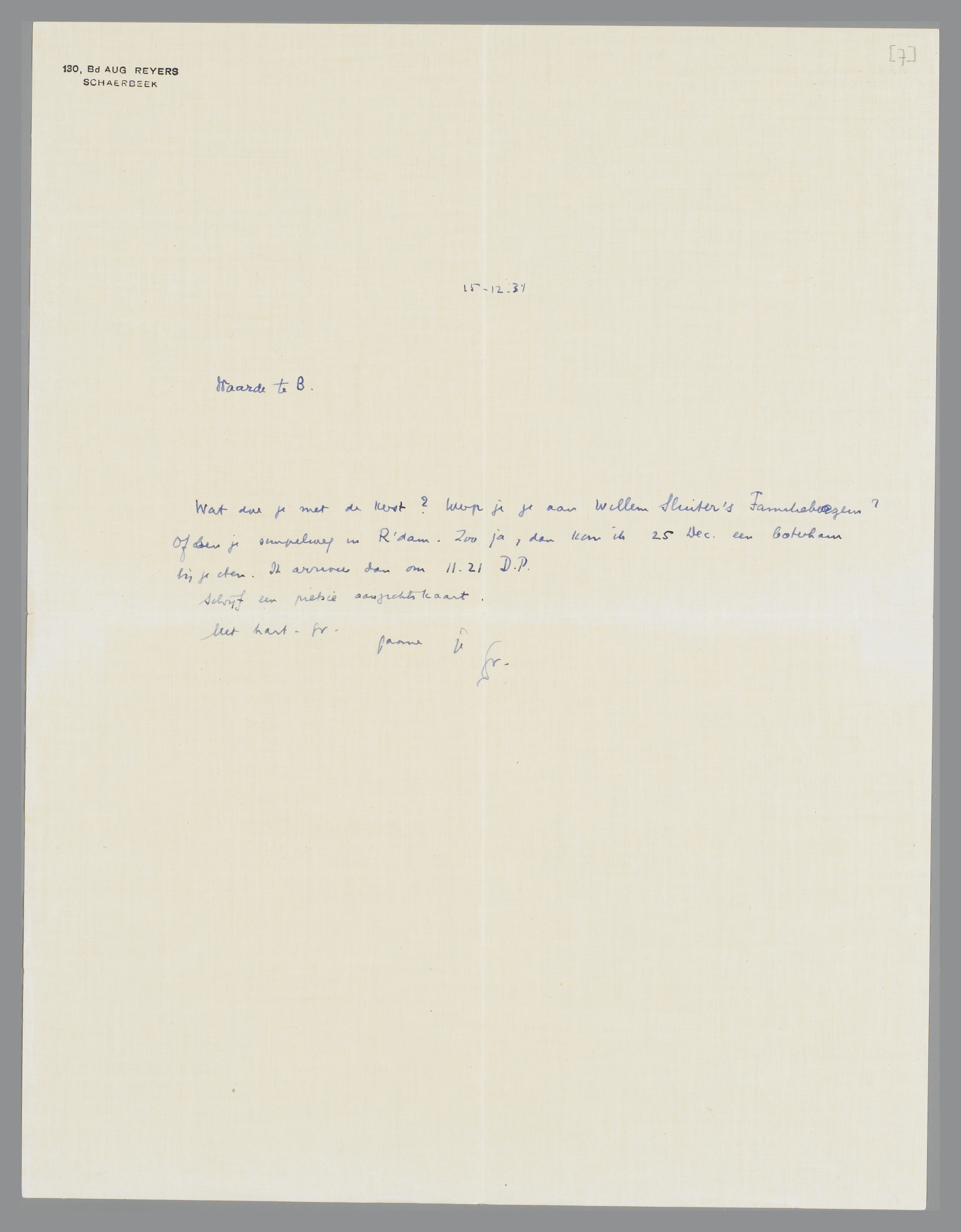 Wat doe je met de Kerst? Werp je je aan Willem Sluiter's Familieboezem? Of ben je simpelweg in R'dam. Zoo ja, dan kom ik 25 Dec. een boterham bij je eten. Ik arriveer dan om 11.21 D.P.