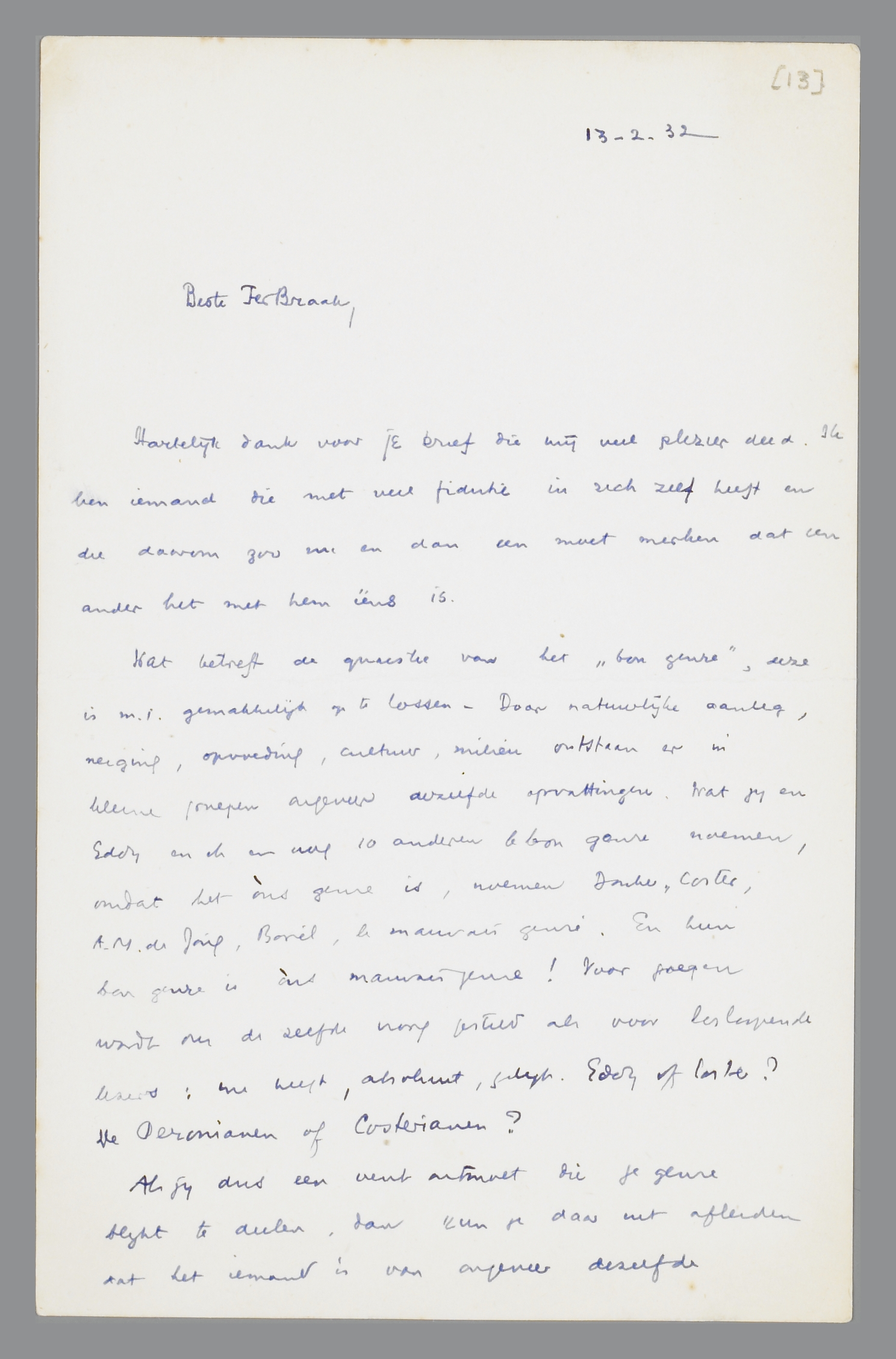Wat betreft de quaestie van het ‘bon genre’, deze is m.i. gemakkelijk op te lossen. Door natuurlijke aanleg, neiging, opvoeding, cultuur, milieu ontstaan er in kleine groepen ongeveer dezelfde opvattingen. Wat jij en Eddy en ik en nog 10 anderen le bon genre noemen, omdat het òns genre is, noemen Donker, Coster, A.M. de Jong, Borel, le mauvais genre. En hun bon genre is òns mauvais genre! Voor groepen wordt nu de zelfde vraag gesteld als voor loslopende lezers: wie heeft, absoluut, gelijk. Eddy of Coster? De Peronianen of Costerianen?