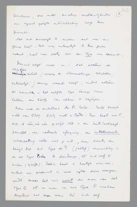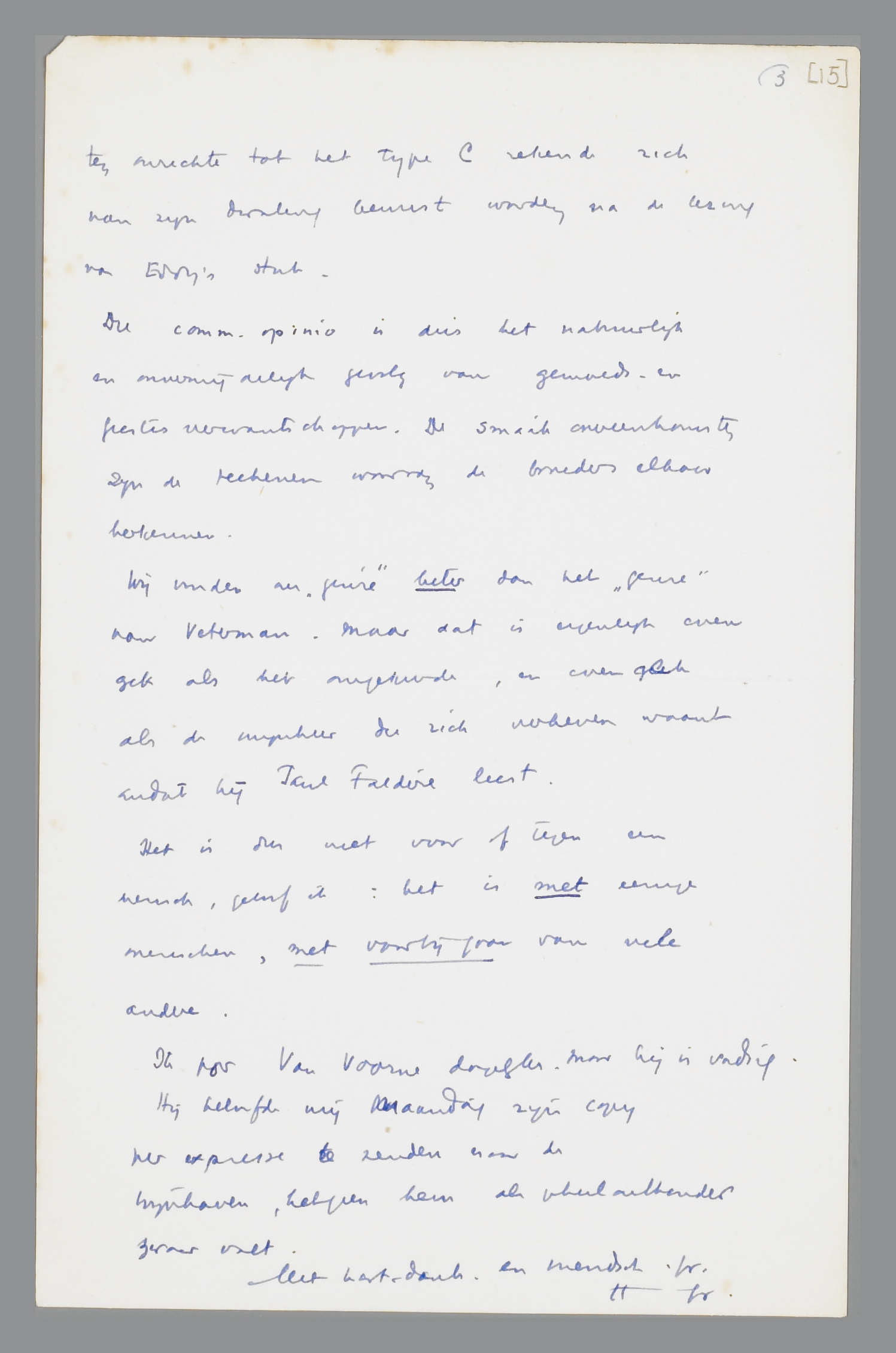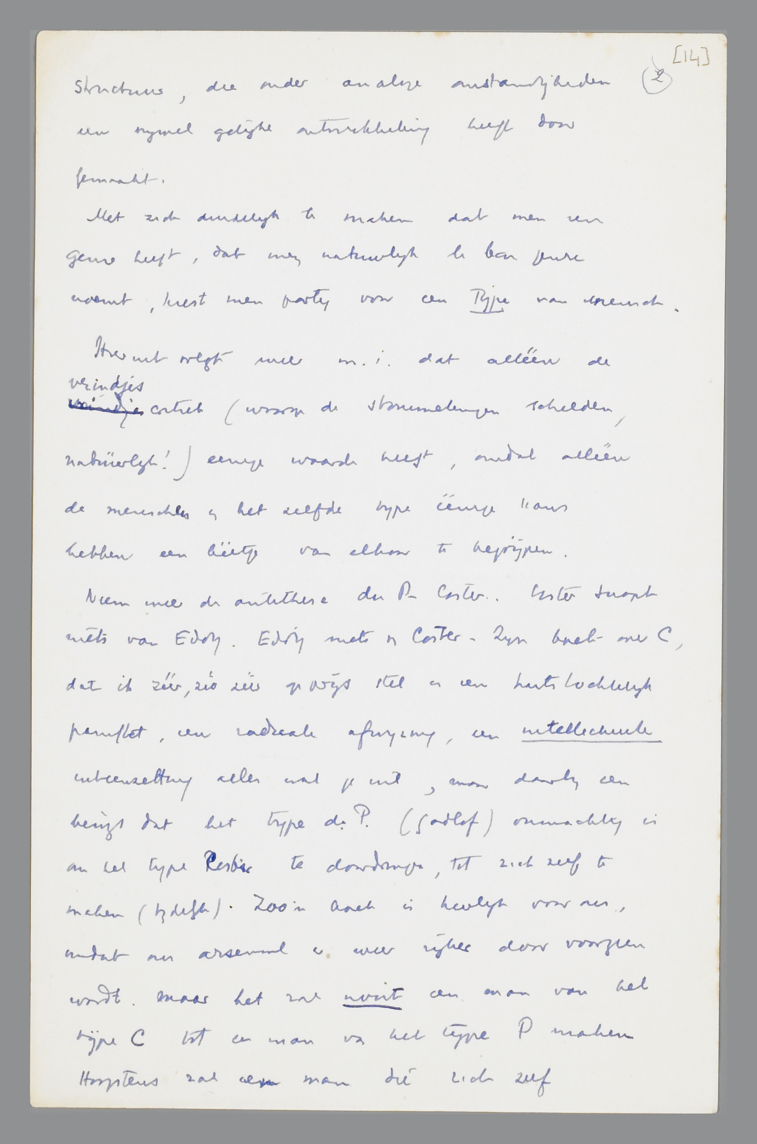 Neem mee de antithese du P. - Coster. Coster snapt niets van Eddy. Eddy niets van Coster. Zijn boek over C., dat ik zéér, zéér zéér op prijs stel is een hartstochtelijk pamflet, een radicale afwijzing, een intellectueele uiteenzetting alles wat je wil, maar daarbij een bewijs dat het type du P. (Godlof) onmachtig is om het type Coster te doordringen, tot zich zelf te maken (tijdelijk). Zoo'n boek is heerlijk voor ons, omdat ons arsenaal er weer rijker door voorzien wordt. Maar het zal nooit een man van het type C. tot een man van het type P. maken. Hoogstens zal een man die zich zelf ten onrechte tot het type C rekende zich van zijn dwalerij bewust worden na de lezing van Eddy's stuk.