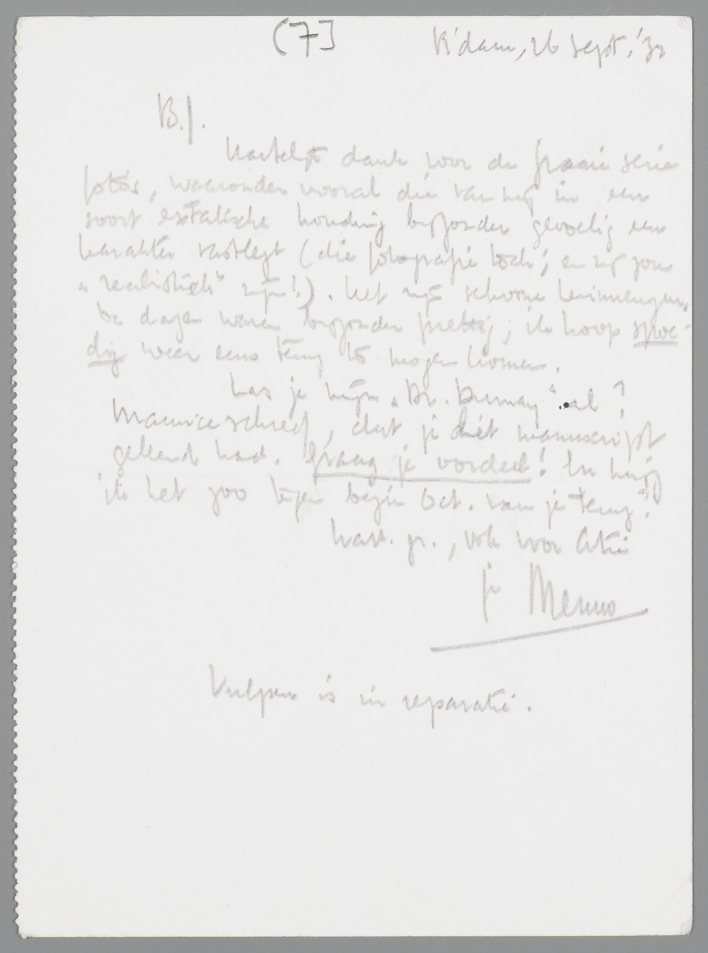 Las je mijn ‘Dr. Dumay’ al? Maurice schreef, dat je het manuscript geleend had. Graag je oordeel! En krijg ik het zoo tegen begin Oct. terug?