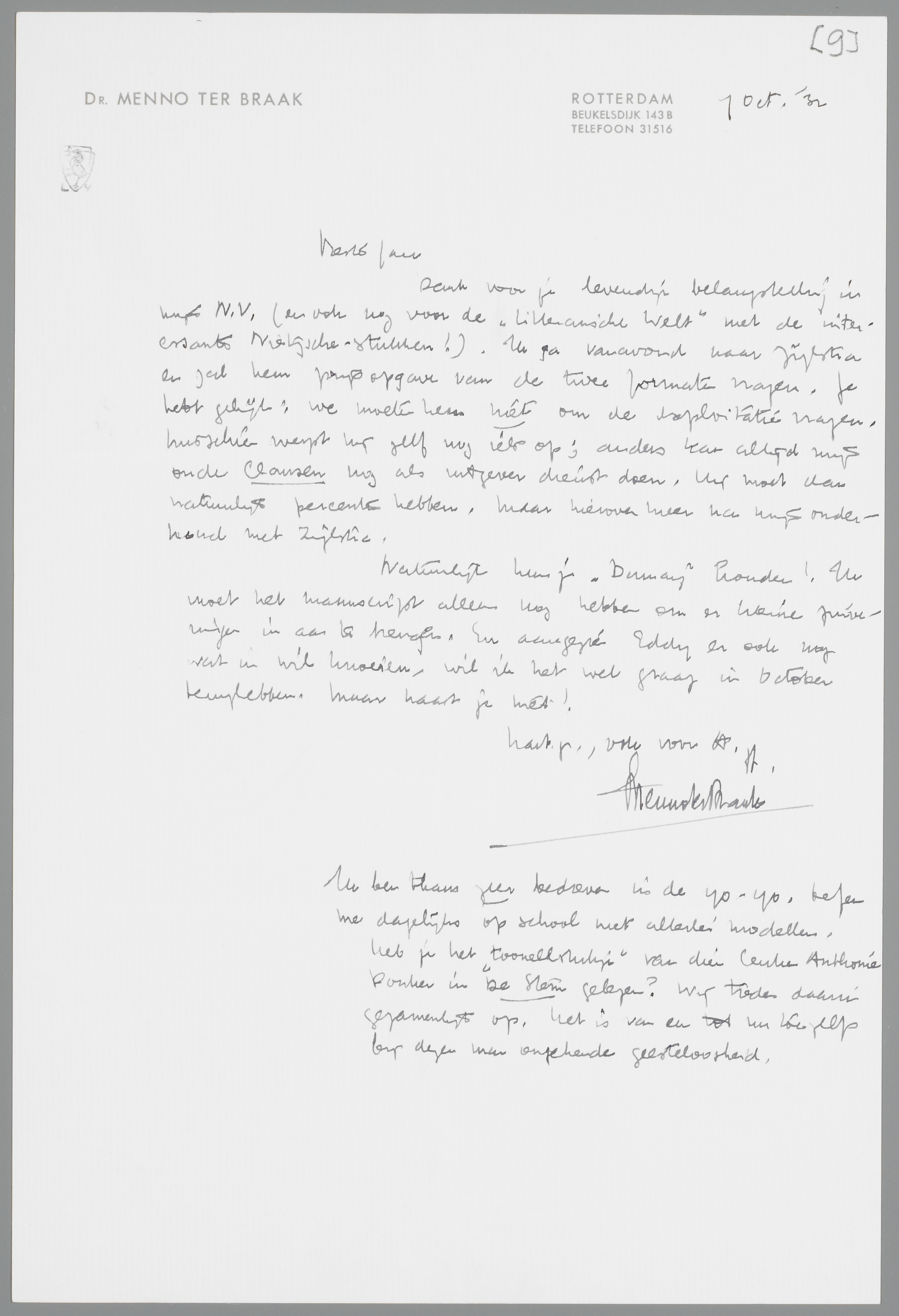 Dank voor je levendige belangstelling in mijn N.V. (en ook nog voor de ‘litterarische Welt’ met de interessante Nietzsche-stukken!). Ik ga vanavond naar Zijlstra en zal hem prijsopgave van de twee formaten vragen. Je hebt gelijk: we moeten hem niet om de exploitatie vragen, misschien werpt hij zelf nog iets op; anders kan altijd mijn oude Clausen nog als uitgever dienst doen. Hij moet dan natuurlijk percenten hebben, maar hierover meer na mijn onderhoud met Zijlstra.