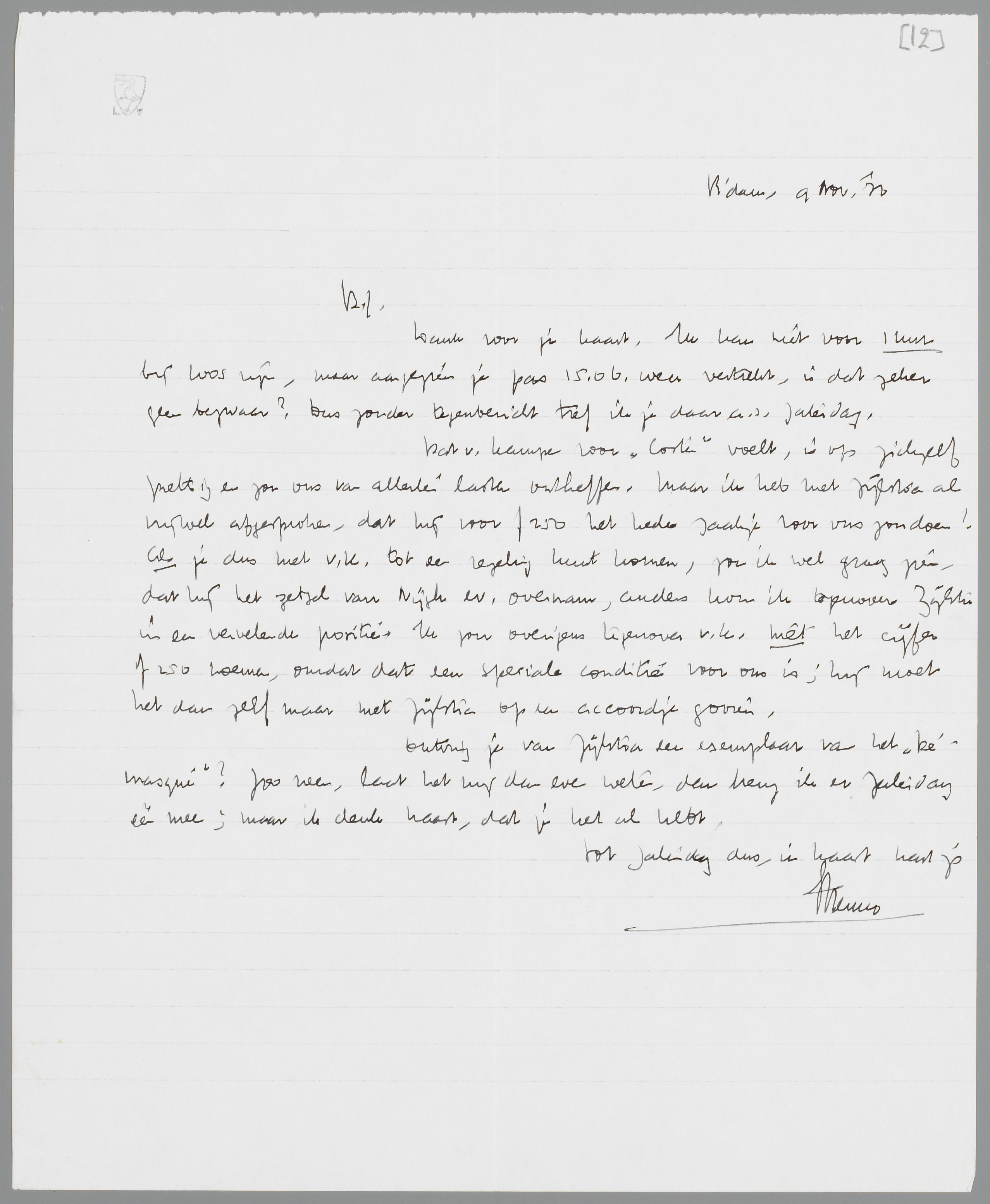Dat v. Kampen voor ‘Coster’ voelt, is op zichzelf prettig en zou ons van allerlei lasten ontheffen. Maar ik heb met Zijlstra al vrijwel afgesproken, dat hij voor ƒ250 het heele zaakje voor ons zou doen! Als je dus met v.K. tot een regeling kunt komen, zou ik wel graag zien, dat hij het zetsel van Nijgh ev. overnam, anders kom ik tegenover Zijlstra in een vervelende positie. Ik zou overigens tegenover v.K. niet het cijfer ƒ250 noemen, omdat dat een speciale conditie voor ons is; hij moet het dan zelf maar met Zijlstra op een accoordje gooien.