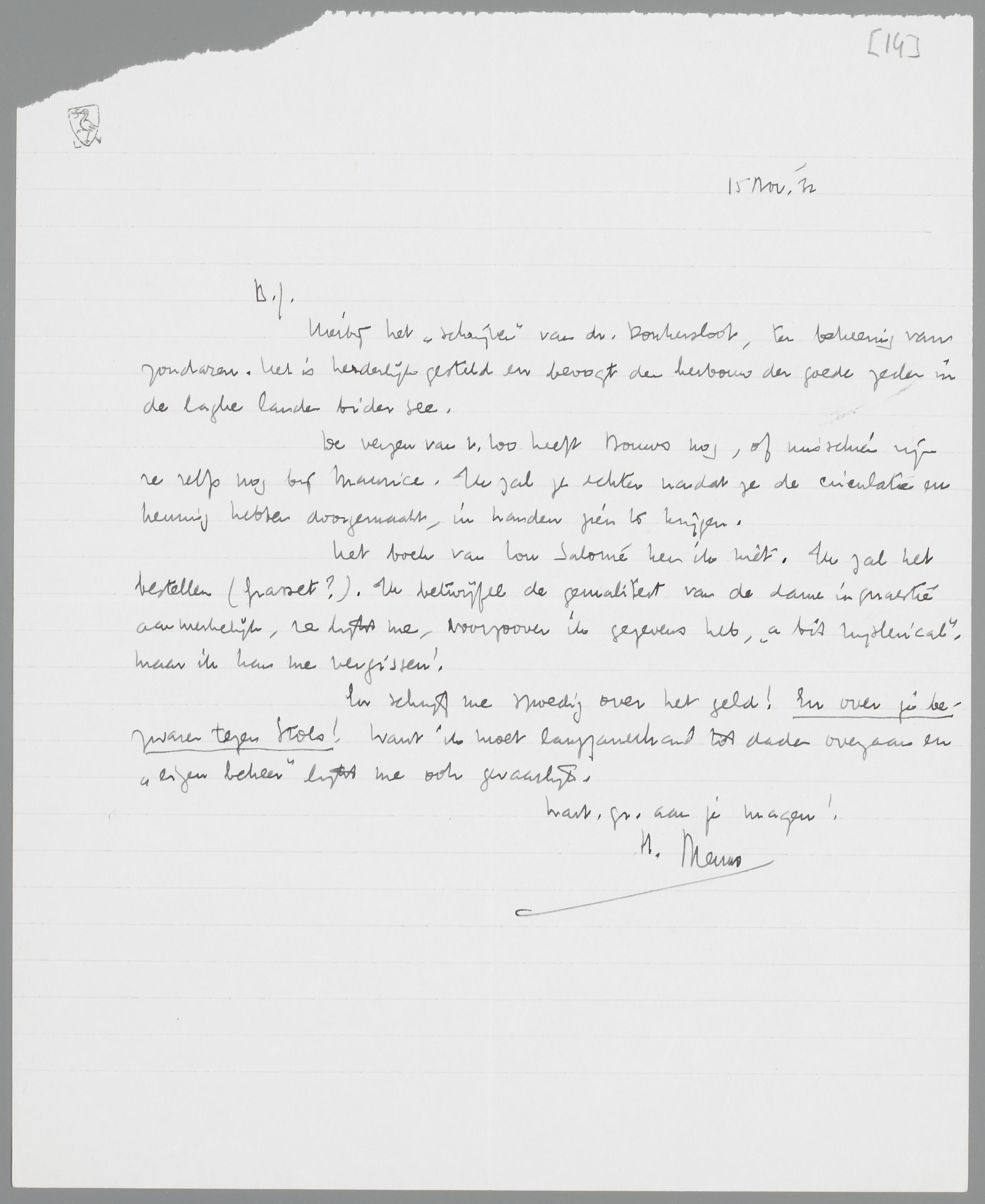 En schrijf me spoedig over het geld! En over je bezwaren tegen Stols! Want ik moet langzamerhand tot daden overgaan en ‘eigen beheer’ lijkt me ook gevaarlijk.