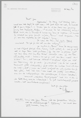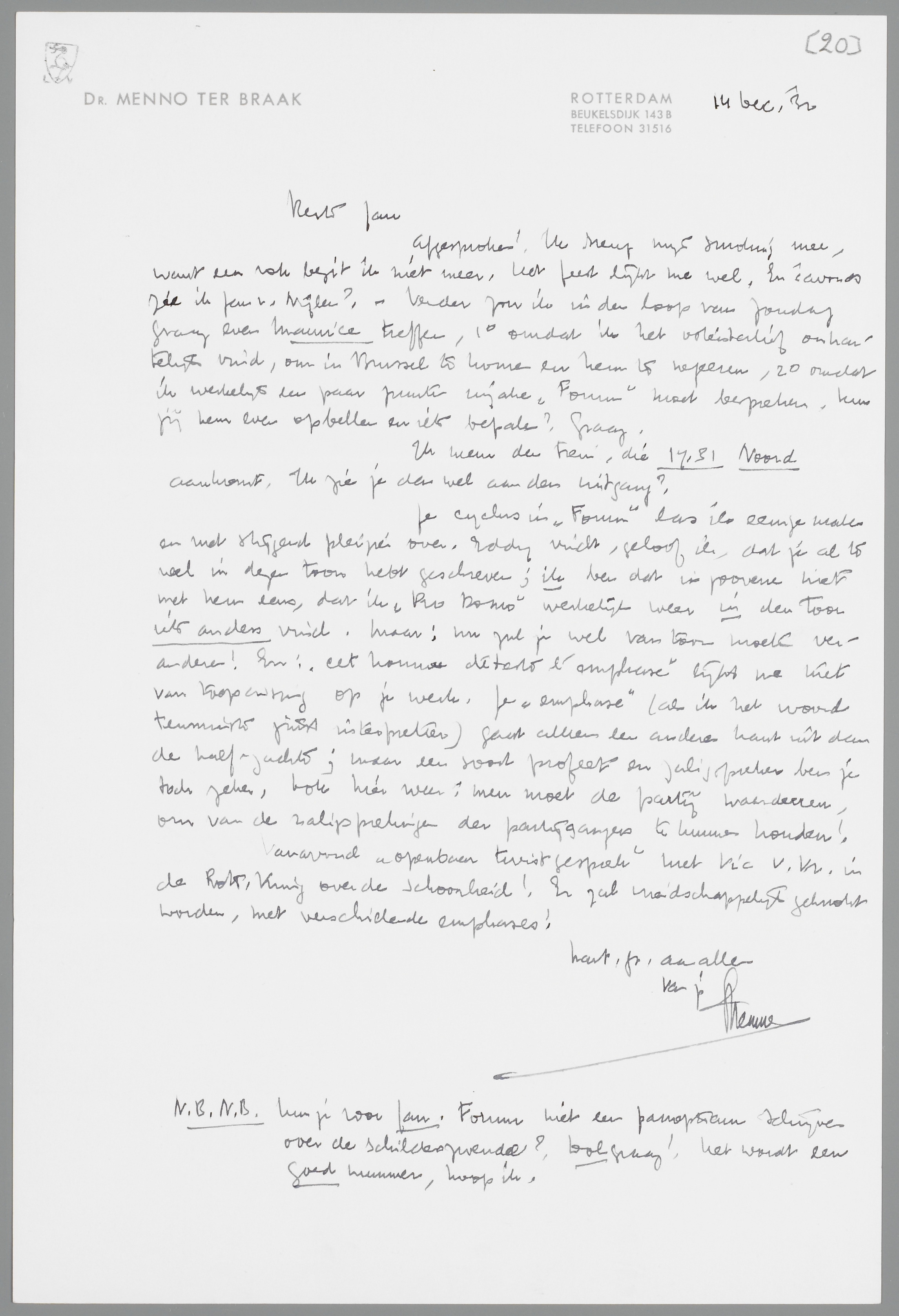 Je cyclus in ‘Forum’ las ik eenige malen en met stijgend pleizier over. Eddy vindt, geloof ik, dat je al te veel in dezen toon hebt geschreven; ik ben dat in zooverre niet met hem eens, dat ik ‘Pro Domo’ werkelijk weer in den toon iets anders vind. Maar: nu zul je wel van toon moeten veranderen! En: ‘cet homme déteste l'emphase’ lijkt me niet van toepassing op je werk. Je ‘emphase’ (als ik het woord tenminste juist interpreteer) gaat alleen een anderen kant uit dan de half-zachte; maar een soort profeet en zaligspreker ben je toch zeker, ook hier weer: men moet de partij waardeeren, om van de zaligsprekingen der partijgangers te kunnen houden!