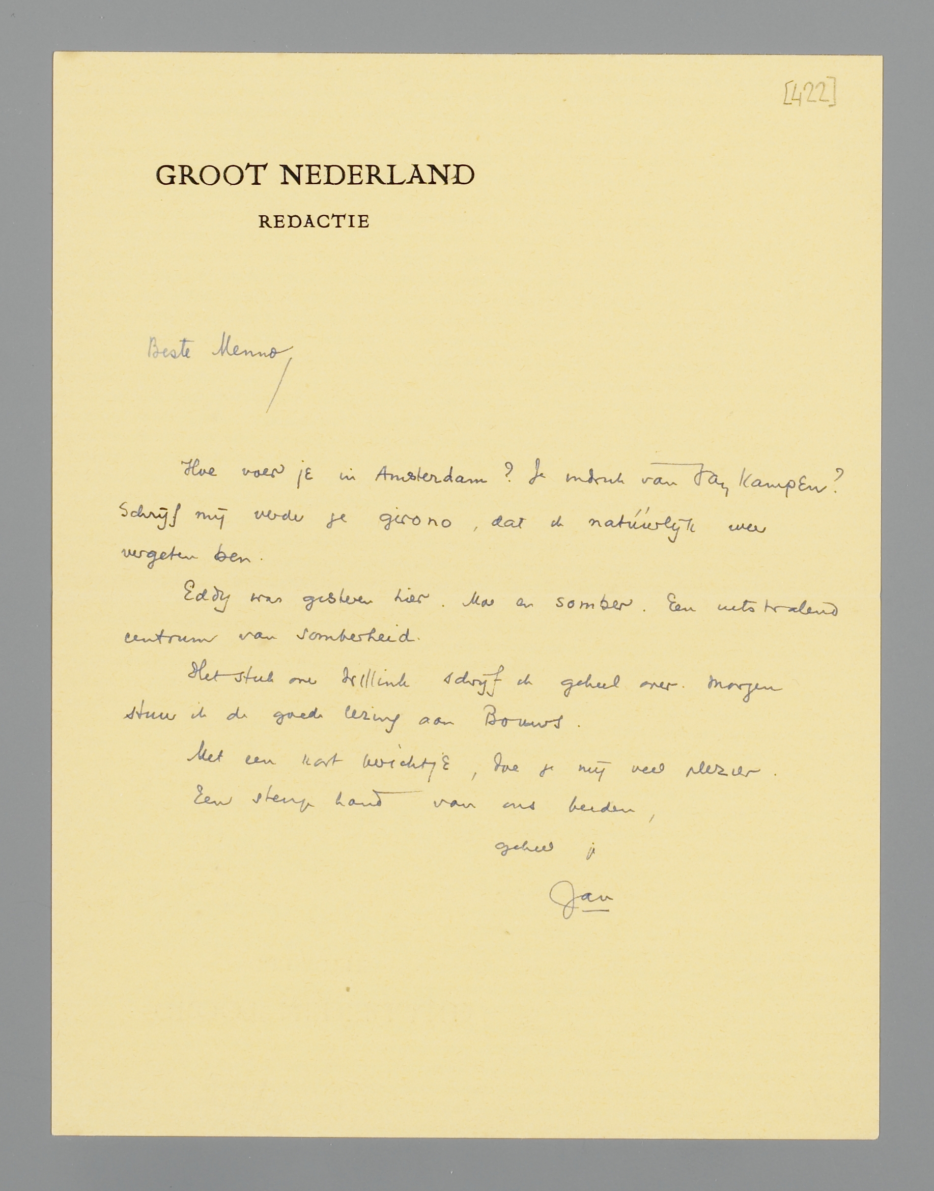Hoe voer je in Amsterdam? Je indruk van Jan Kampen? Schrijf mij verder je giro no, dat ik natuurlijk weer vergeten ben.