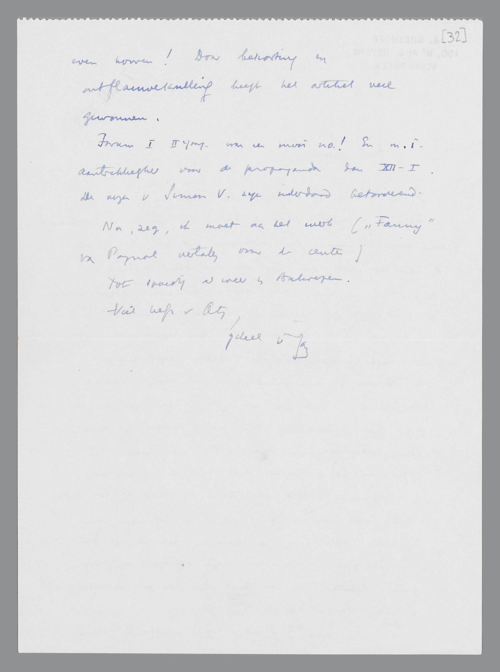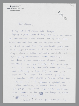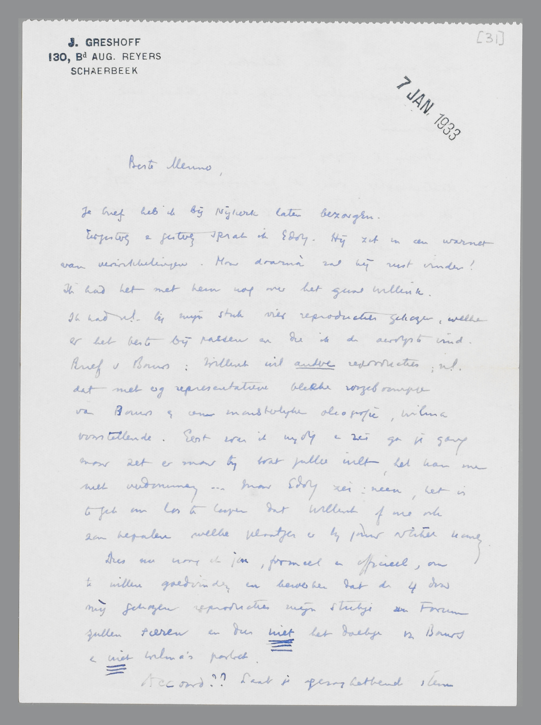 Ik had nl. bij mijn stuk vier reproducties gekregen, welke er het beste bij passen en die ik de aardigste vind. Brief v Bouws: Willink wil andere reproducties; nl. dat niet erg representatieve bleeke rozeboompje van Bouws en een monsterlijke oliografie, Wilma voorstellende. Eerst was ik nijdig en zei ga je gang maar en zet er maar bij wat jullie wilt, het kan me niet verdommen..... maar Eddy zei: neen, het is te gek om los te loopen dat Willink of wie ook zou bepalen welke plaatjes er bij jouw artikel komen.