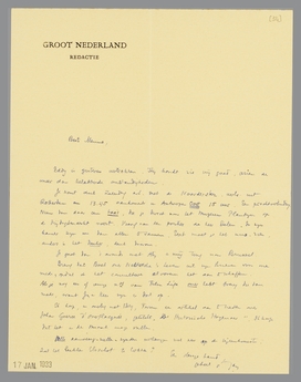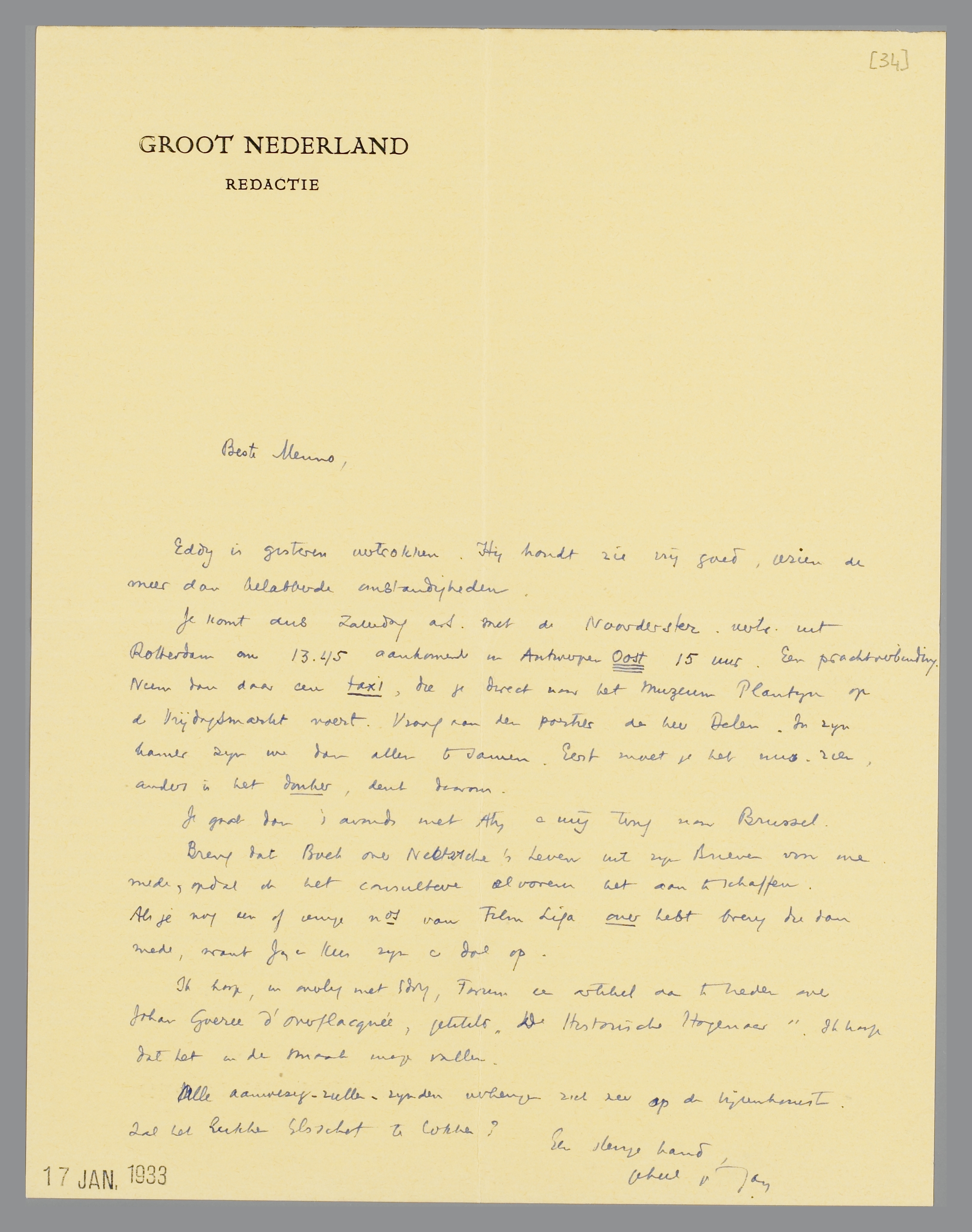 Je komt dus Zaterdag as. met de Noorderster vertr. uit Rotterdam om 13.45 aankomend in Antwerpen Oost 15 uur. Een prachtverbinding. Neem dan daar een taxi, die je direct naar het Museum Plantyn op de Vrijdagsmarkt voert. Vraag aan den portier de heer Delen. In zijn kamer zijn we dan allen tesamen. Eerst moet je het mus. zien, anders is het donker, denk daarom.