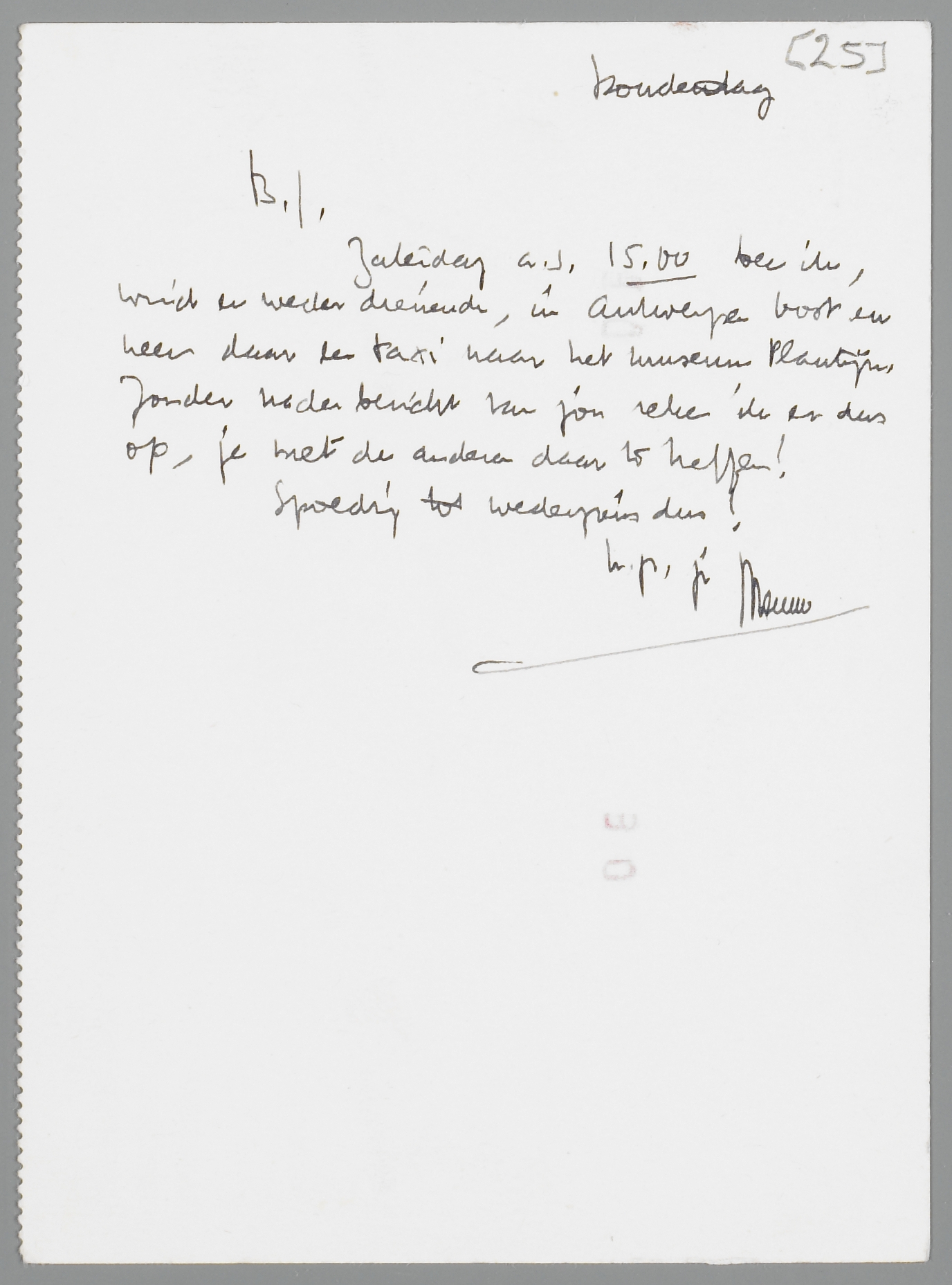 Zaterdag a.s. 15.00 ben ik, wind en weder dienende, in Antwerpen Oost en neem daar een taxi naar het museum Plantijn. Zonder nader bericht van jou reken ik er dus op, je met de anderen daar te treffen!