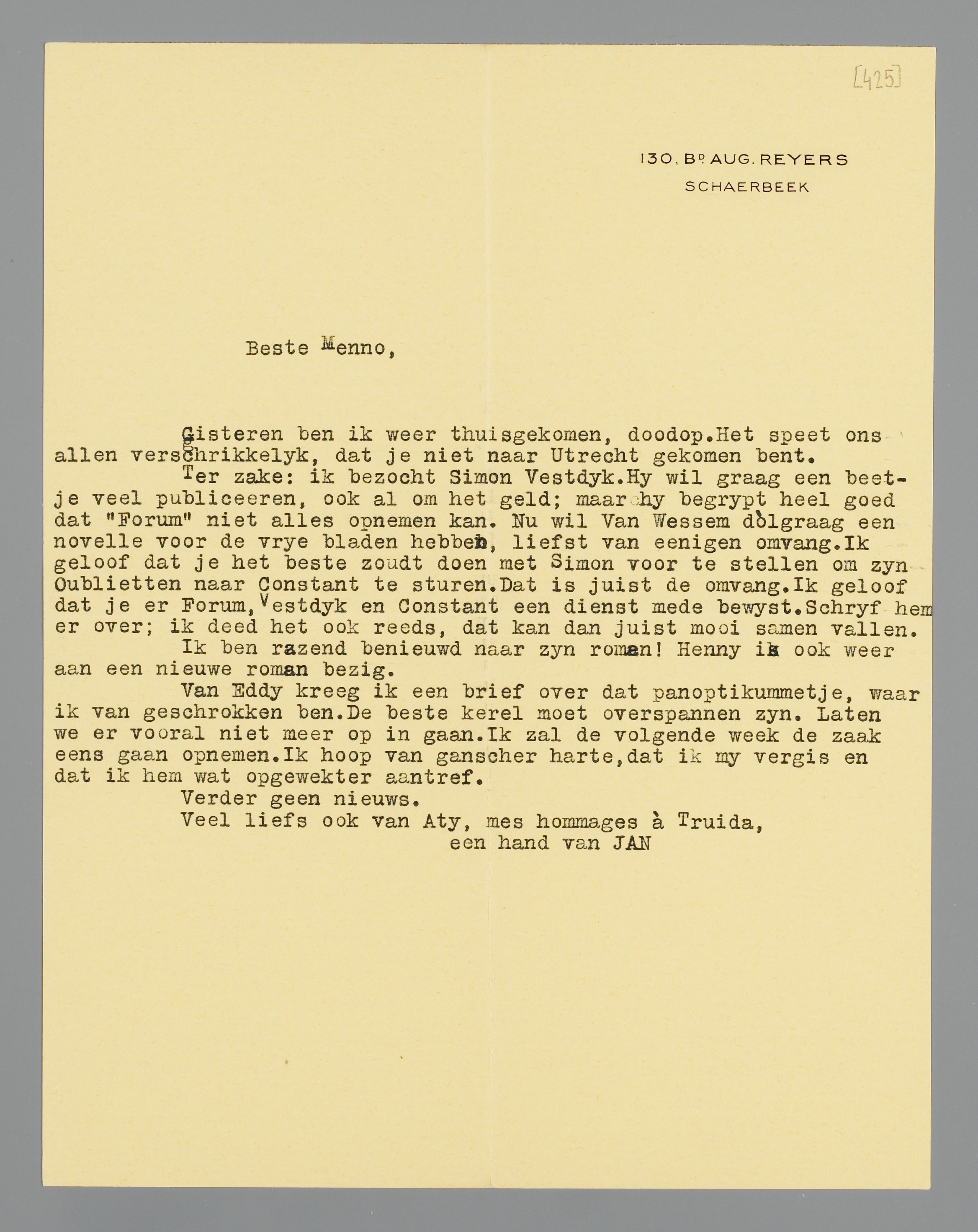 Ter zake: ik bezocht Simon Vestdijk. Hij wil graag een beetje veel publiceeren, ook al om het geld; maar hij begrijpt heel goed dat ‘Forum’ niet alles opnemen kan. Nu wil Van Wessem dòlgraag een novelle voor de vrije bladen hebben, liefst van eenigen omvang. Ik geloof dat je het beste zoudt doen met Simon voor te stellen om zijn Oublietten naar Constant te sturen. Dat is juist de omvang. Ik geloof dat je er Forum, Vestdijk en Constant een dienst mede bewijst. Schrijf hem er over; ik deed het ook reeds, dat kan dan juist mooi samen vallen.