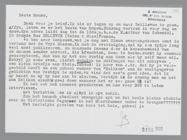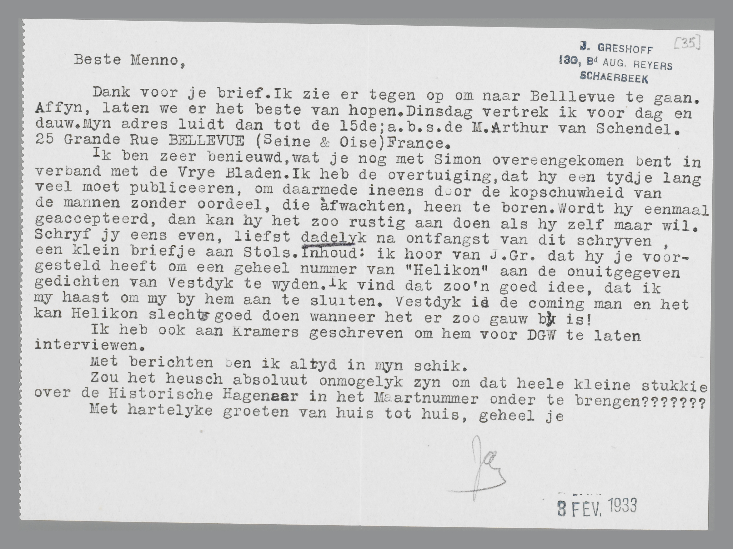 Ik ben zeer benieuwd, wat je nog met Simon overeengekomen bent in verband met de Vrije Bladen. Ik heb de overtuiging, dat hij een tijdje lang veel moet publiceeren, om daarmede ineens door de kopschuwheid van de mannen zonder oordeel, die àfwachten, heen te boren. Wordt hij eenmaal geaccepteerd, dan kan hij het zoo rustig aan doen als hij zelf maar wil. Schrijf jij eens even, liefst dadelijk na ontvangst van dit schrijven, en klein briefje aan Stols. Inhoud: ik hoor van J. Gr. dat hij je voorgesteld heeft om een geheel nummer van ‘Helikon’ aan de onuitgegeven gedichten van Vestdijk te wijden. Ik vind dat zoo'n goed idee, dat ik mij haast om mij bij hem aan te sluiten. Vestdijk is de coming man en het kan Helikon slechts goed doen wanneer het er zoo gauw bij is!