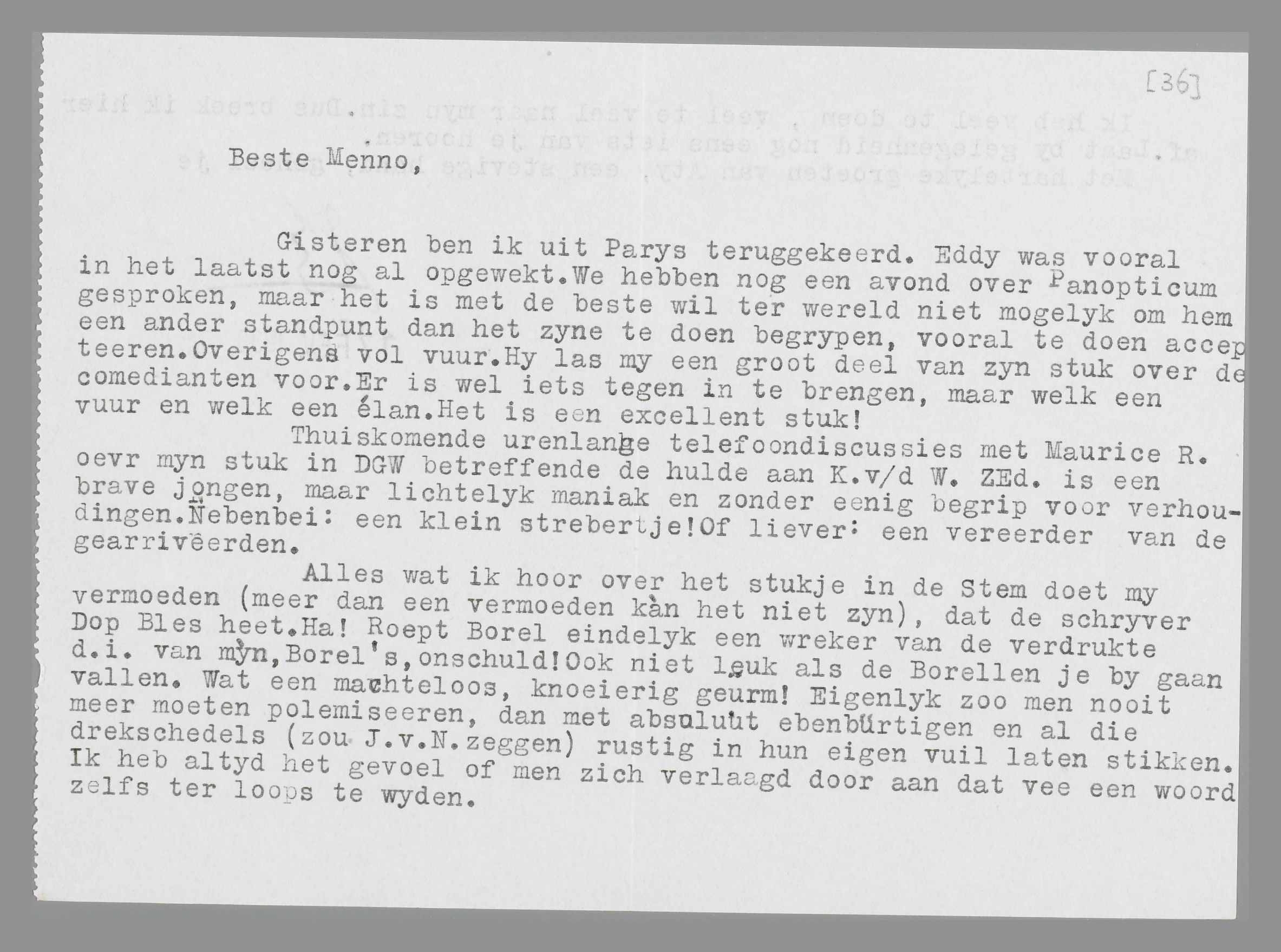 Alles wat ik hoor over het stukje in de Stem doet mij vermoeden (meer dan vermoeden kàn het niet zijn), dat de schrijver Dop Bles heet. Ha! Roept Borel eindelijk een wreker van de verdrukte d.i. van míjn, Borel's, onschuld! Ook niet leuk als de Borellen je bij gaan vallen. Wat een machteloos, knoeierig geürm! Eigenlijk zou men nooit meer moeten polemiseeren, dan met absoluut ebenbürtigen en al die drekschedels (zou J.v.N. zeggen) rustig in hun eigen vuil laten stikken. Ik heb altijd het gevoel of men zich verlaagt door aan dat vee een woord zelfs ter loops te wijden.