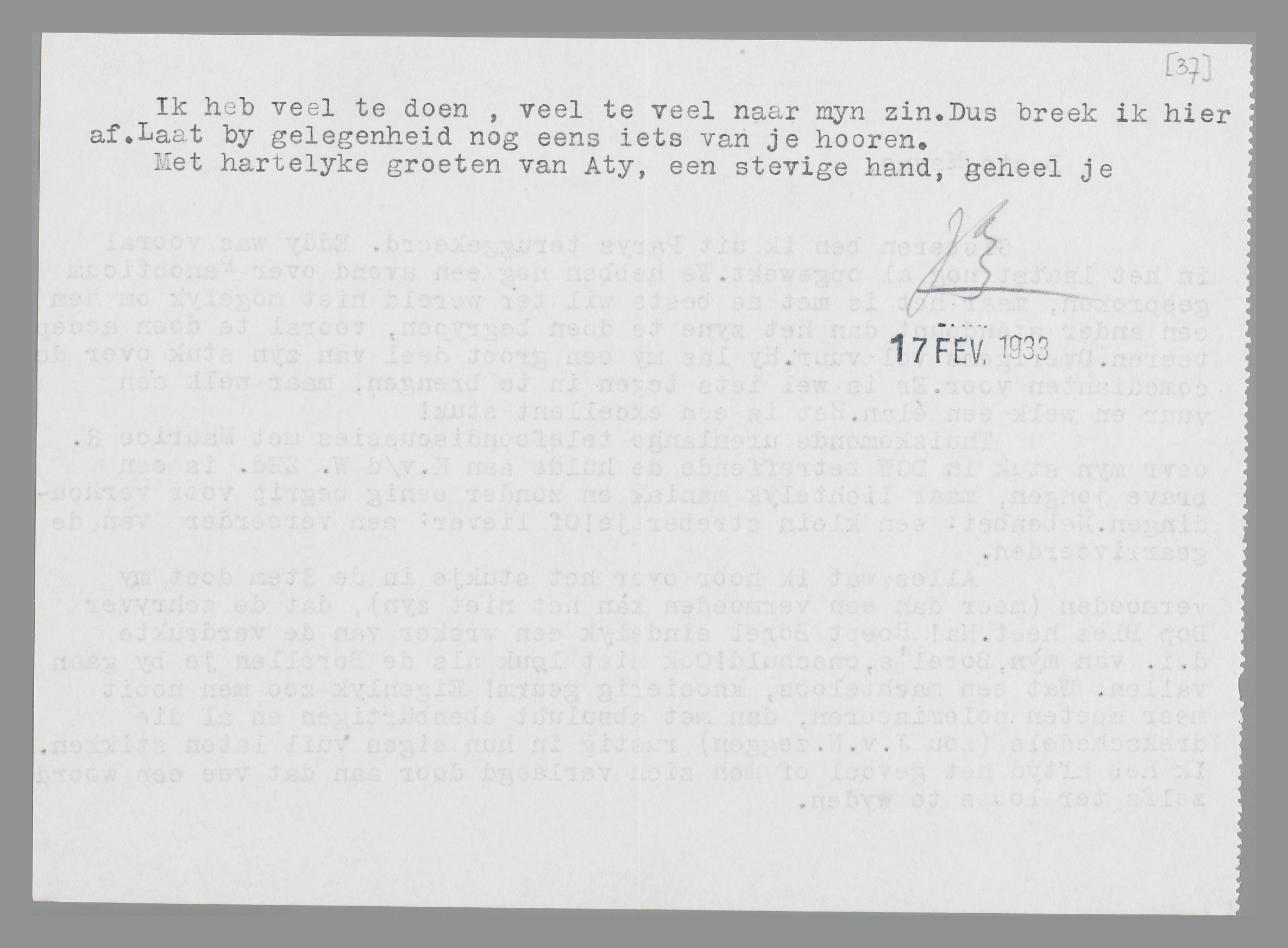 Ik heb veel te doen, veel te veel naar mijn zin. Dus breek ik hier af. Laat bij gelegenheid nog eens iets van je hooren.