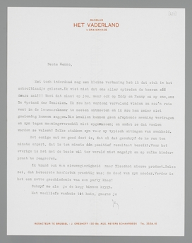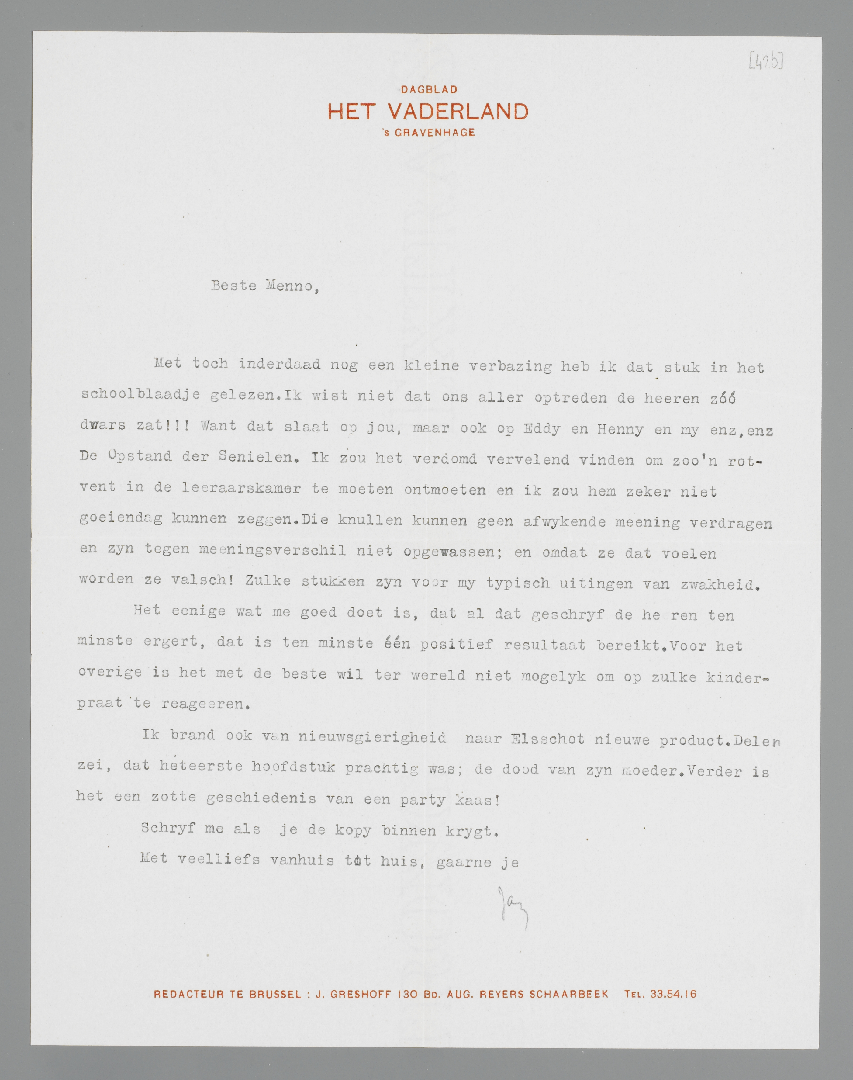 Met toch inderdaad nog een kleine verbazing heb ik dat stuk in het schoolblaadje gelezen. Ik wist niet dat ons aller optreden de heeren zóó dwars zat!!! Want dat slaat op jou, maar ook op Eddy en Henny en mij enz, enz. De Opstand der Senielen. Ik zou het verdomd vervelend vinden om zoo'n rotvent in de leeraarskamer te moeten ontmoeten en ik zou hem zeker niet goeiendag kunnen zeggen. Die knullen kunnen geen afwijkende meening verdragen en zijn tegen meeningsverschil niet opgewassen; en omdat ze dat voelen worden ze valsch! Zulke stukken zijn voor mij typisch uitingen van zwakheid.
