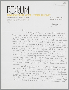 Dank voor je brieven en ‘zendingen’! Ik vind alle 5 panoptica zeer geslaagd, heb ze aan Bouws doorgegeven. Mijn eenige reserve is: in April zouden ze door de gebeurtenissen ingehaald kunnen zijn, en: hebben wij plaats. Het is een verdomd ding met die plaatsruimte, we konden tweemaal zooveel papier gebruiken. Het stuk over de fransche bloemlezingen lijkt mij het allerbest, maar ook de andere zijn heel goed voor ons. Een zij-idee: zou het (eventueel) mogelijk zijn, dat je de drie stukjes betreffende Hitler c.s. tot één omwerkte? Alleen als plaatsgebrek dat noodig maakt. - Het Maartnummer kost ook weer een massa hoofdbrekens. Het klinkt gek, maar ik ben bezig je ‘Hagenaar’ er opzettelijk uit te werken! Het heele nummer bleek opeens weer Greshoff - ter Braak - du Perron te zijn en niets anders! In godsnaam, vergeef mij; de taak van redacteur is walgelijk, strijdt tegen mijn persoonlijke voorkeur, maar nummer is nummer.