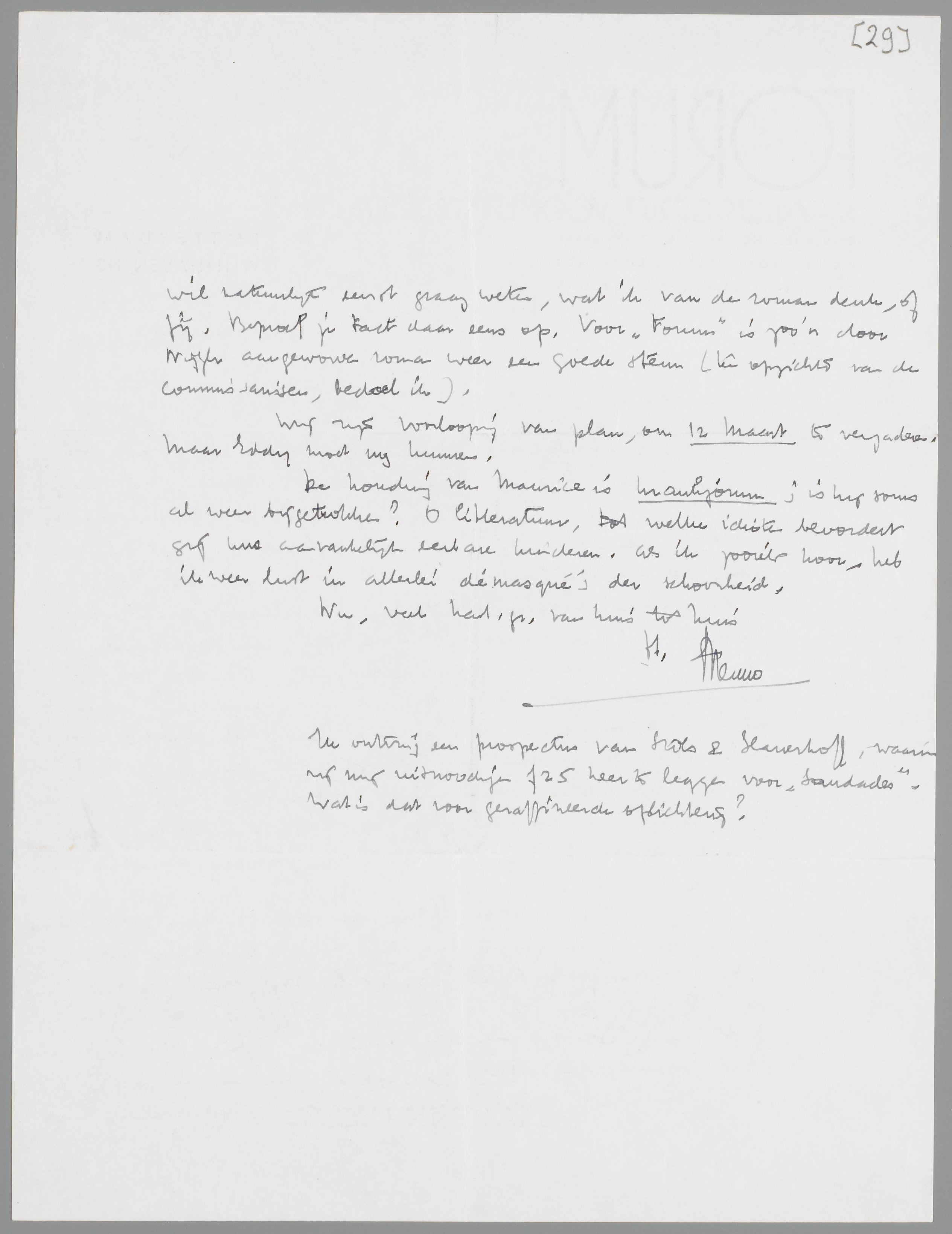 Nog iets: Zijlstra interesseert zich voor ‘Kaas’, als boek. Mij persoonlijk zou het erg aangenaam zijn, als Elsschot bij Nijgh uitgaf, omdat het mij dan gemakkelijk valt, na het beëindigen van ‘Dumay’ aan de 80 pag. vast te houden. Als we Elsschot publiceeren, loopt dat dan niet zoo in de papieren. Zou je daarom bij Elsschot eens een balletje kunnen opgooien daarover? Zijlstra is natuurlijk bereid met hem te komen onderhandelen, maar wil natuurlijk eerst graag weten, wat ik van de roman denk, of jij. Beproef je tact daar eens op. Voor ‘Forum’ is zoo'n door Nijgh aangeworven roman weer een goede steun (ten opzichte van de commissarissen, bedoel ik).