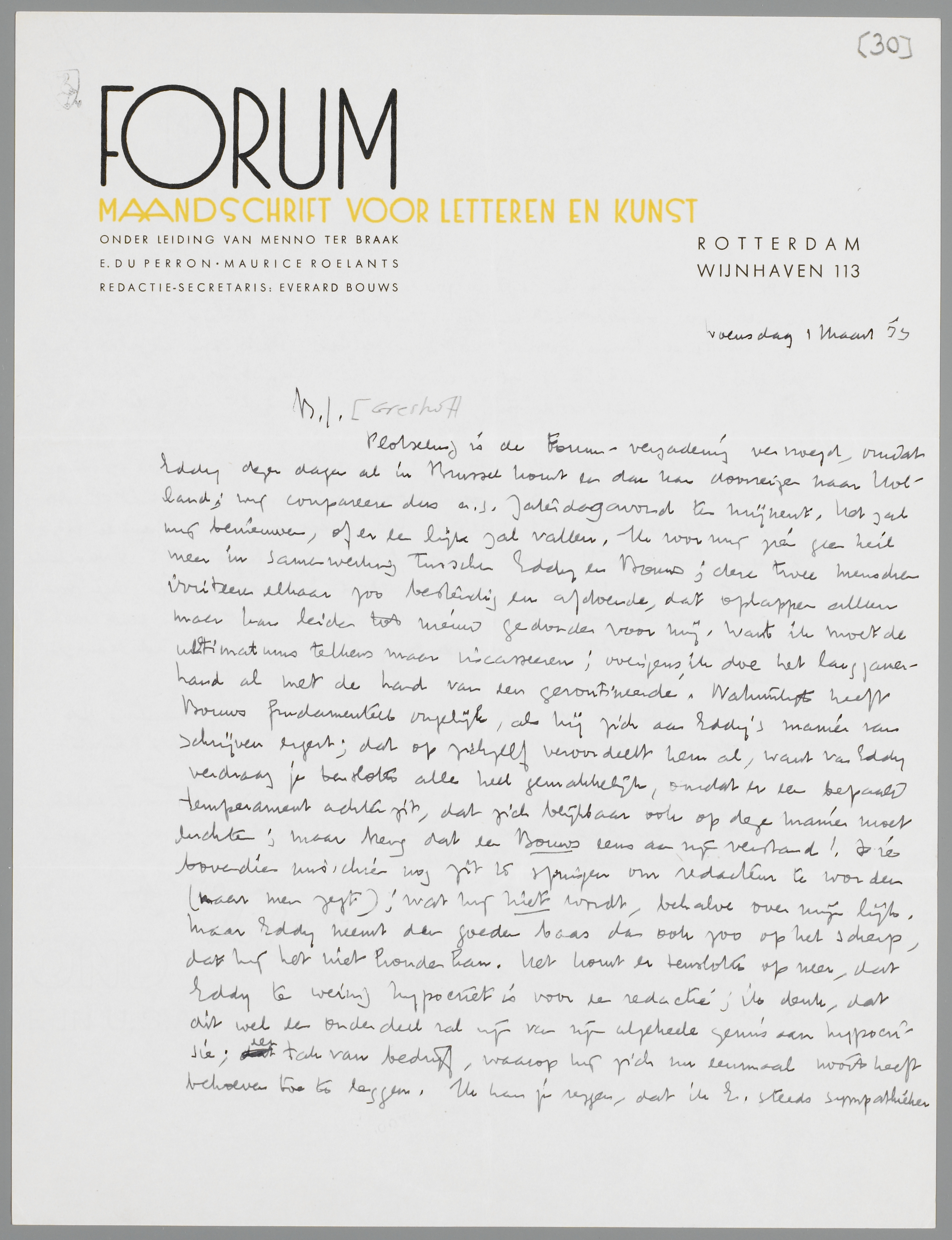 Plotseling is de Forum-vergadering vervroegd, omdat Eddy dezer dagen al in Brussel komt en dan kan doorreizen naar Holland; wij compareeren dus a.s. Zaterdagavond ten mijnent. Het zal mij benieuwen, of er een lijk zal vallen. Ik voor mij zie geen heil meer in samenwerking tusschen Eddy en Bouws; deze twee menschen irriteeren elkaar zoo bestendig en afdoende, dat oplappen alleen maar kan leiden tot nieuw gedonder voor mij. Want ik moet de ultimatums telkens maar incasseeren; overigens, ik doe het langzamerhand al met de hand van een geroutineerde. Natuurlijk heeft Bouws fundamenteel ongelijk, als hij zich aan Eddy's manier van schrijven ergert; dat op zichzelf veroordeelt hem al, want van Eddy verdraag je tenslotte alles heel gemakkelijk, omdat er een bepaald temperament achterzit, dat zich blijkbaar ook op deze manier moet luchten; maar breng dat een Bouws eens aan zijn verstand! Die bovendien misschien nog zit te springen om redacteur te worden (naar men zegt); wat hij niet wordt, behalve over mijn lijk. Maar Eddy neemt den goeden baas dan ook zoo op het scherp, dat hij het niet houden kan. Het komt er tenslotte op neer, dat Eddy te weinig hypocriet is voor de redactie; ik denk, dat dit wel een onderdeel zal zijn van zijn algeheele gemis aan hypocrisie; een tak van bedrijf, waarop hij zich nu eenmaal nooit heeft behoeven toe te leggen. Ik kan je zeggen, dat ik E. steeds sympathieker ga vinden, hoe minder ik zijn afzonderlijke uitingen kan volgen. Het is alles zoo compleet uit één stuk (en dit niet in Hitler-zin bedoeld). Dat het rund Bouws zooiets niet kan ruiken, pleit tegen dezen eminenten secretaris der redactie. Hij is een man uit tien stukjes. Maar onderwijl verdom ik het voorloopig, om voor dit ‘geschil’ het heele Forum in de lucht te laten vliegen. Niemand zou daar minder pleizier van hebben dan Eddy, die het papier in Holland toch niet voor het opscheppen zal hebben. - Ondanks E's goede voornemens, om Bouws niet te attaqueeren, verwacht ik toch wel een klein slagje. Als hij hem een z.g. beleefde brief schrijft, weent Bouws al aan mijn telefoon. Dus! Het vervelende voor mij is speciaal, dat ik eeuwig en altijd het betrekkelijke gelijk van Bouws moet erkennen, terwijl ik voor zijn argumenten geen cent voel. Ik geloof, dat Eddy als medewerker zichzelf en mij uit het eeuwige gedonder helpt.