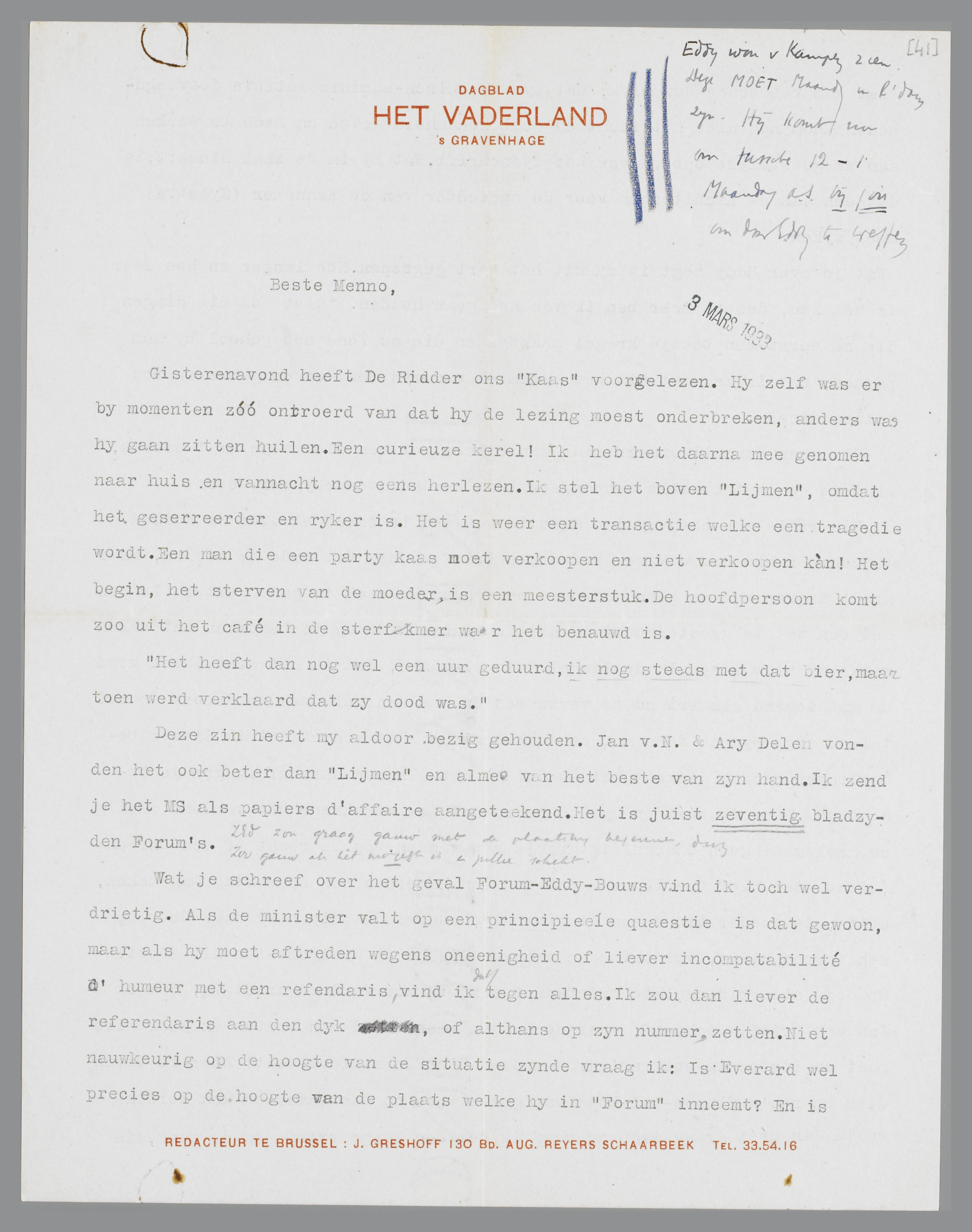 Deze zin heeft mij aldoor bezig gehouden. Jan v.N. & Ary Delen vonden het ook beter dan ‘Lijmen’ en almee van het beste van zijn hand. Ik zend je het MS als papiers d'affaire aangeteekend. Het is juist zeventig bladzijden Forum's. <ZEd zou graag gauw met de plaatsing beginnen, graag zoo gauw als het mogelijk is en jullie schikt.>